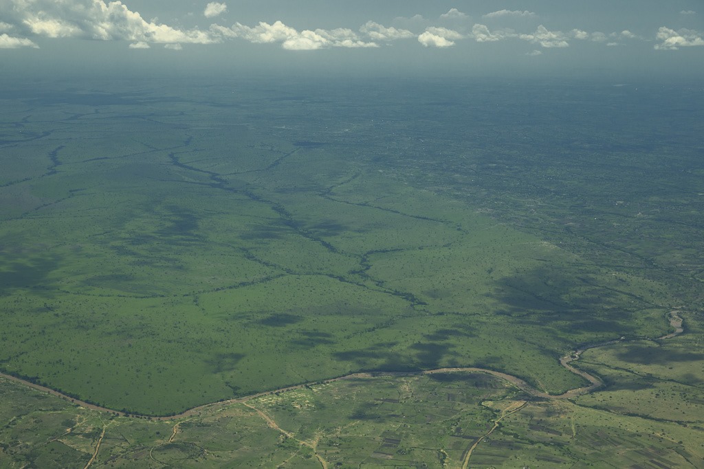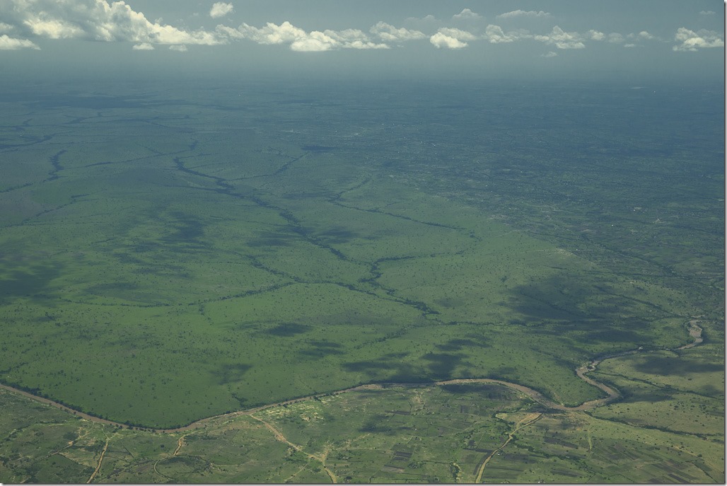 Unser Weiter-Flug geht praktisch auf der gleichen Route wieder zurück zum Masai Mara Park. Wenig später überfliegen wir den direkte daran angrenzenden Serengenti Park in Tansania.