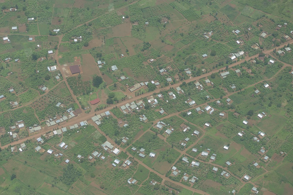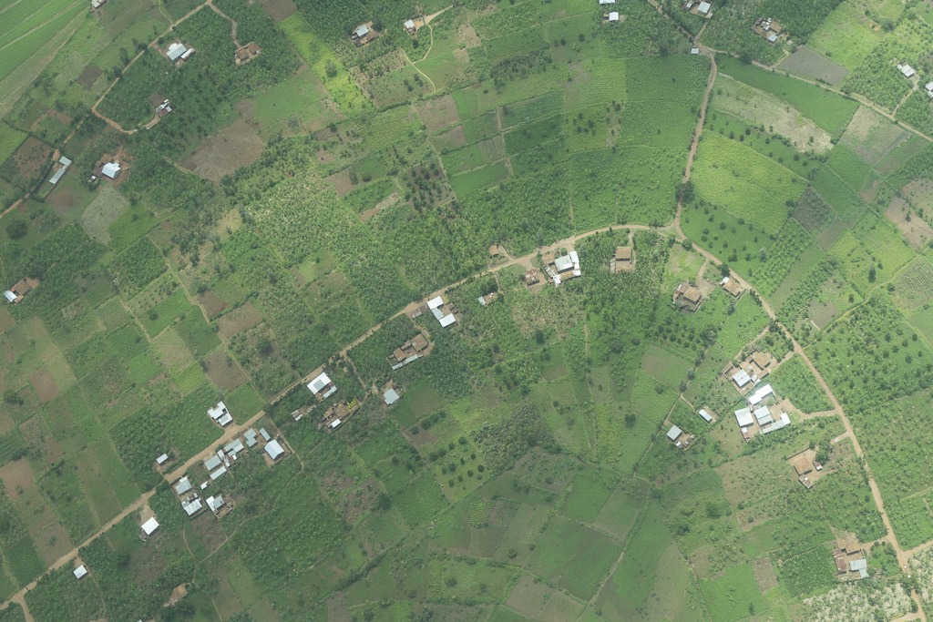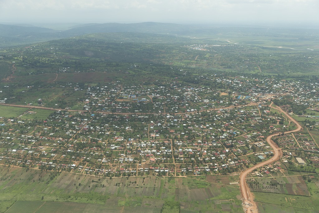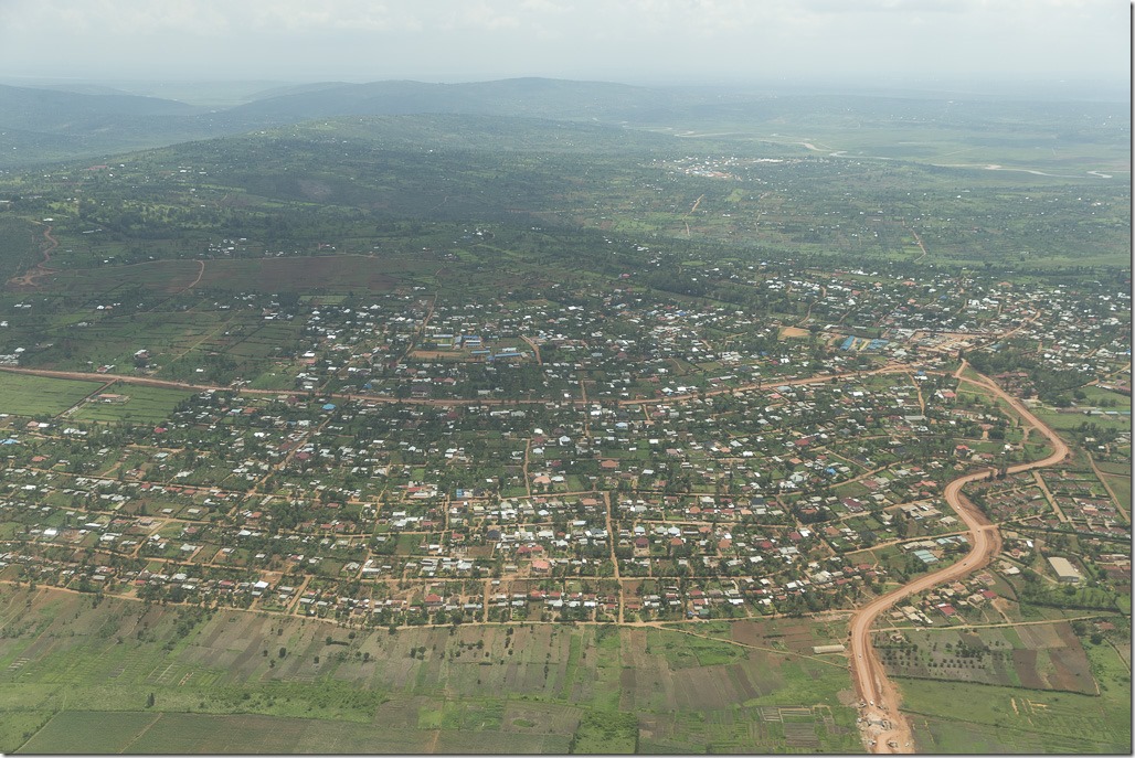 Unsere Strecke von Nairobi nach Kigali ist eine gerade Linie. Schon aus einer Distanz vom über 25 km kann man die Landebahn vor uns erkennen. Es geht aber nicht in direktem Weg zur Landung. Zuerst müssen wir nämlich noch zwei Warteschleifen fliegen, um nicht zu nahe auf ein vor uns fliegendes Flugzeug aufzuschliessen. Die Kurvenlage gibt uns sehr gute Möglichkeiten noch ein paar Fotos vom oben zu schiessen.