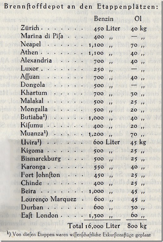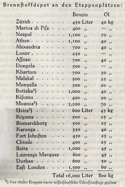 Eine für heutige Verhältnisse nicht mehr vorstellbare Gegebenheit verdient auch noch der Erwähnung: Da Flugbenzin und Öl in diesen Jahren noch ziemlich rare Artikel waren, mussten auf Grund möglichst genauer Berechnungen entlang der Route an voraus bestimmten Landeplätzen Vorratsdepots in zum Flugplan passender Grösse angelegt werden. Insgesamt wurden total 16’000 l Benzin und 800 kg Öl bereitgestellt, welches im Voraus bezahlt werden musste! Die Bestellung dazu erfolgte über die Firma „ASIATIC PETROLEUM CO.“ mit Sitz in London viele Monate im Voraus. Diese Firma übernahm die Versorgung der Depots, wobei alle Lieferungen insgesamt etwa vier Monate beanspruchten und zu entlegenen Orten teilweise bis zu acht Wochen unterwegs waren! Die endgültige Bestätigung, dass alle Depots versorgt seien, traf erst nach der Landung in Kairo ein.