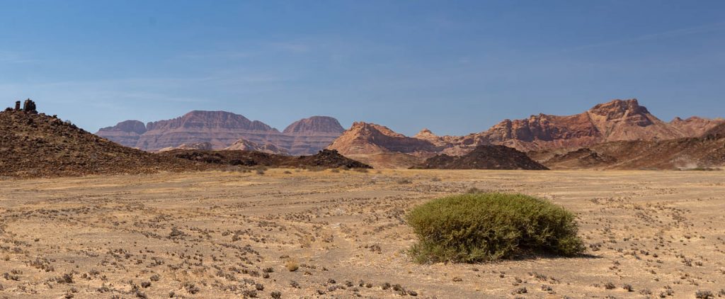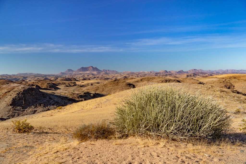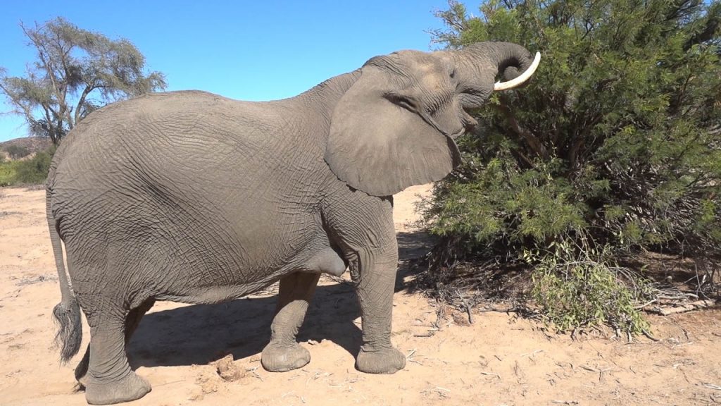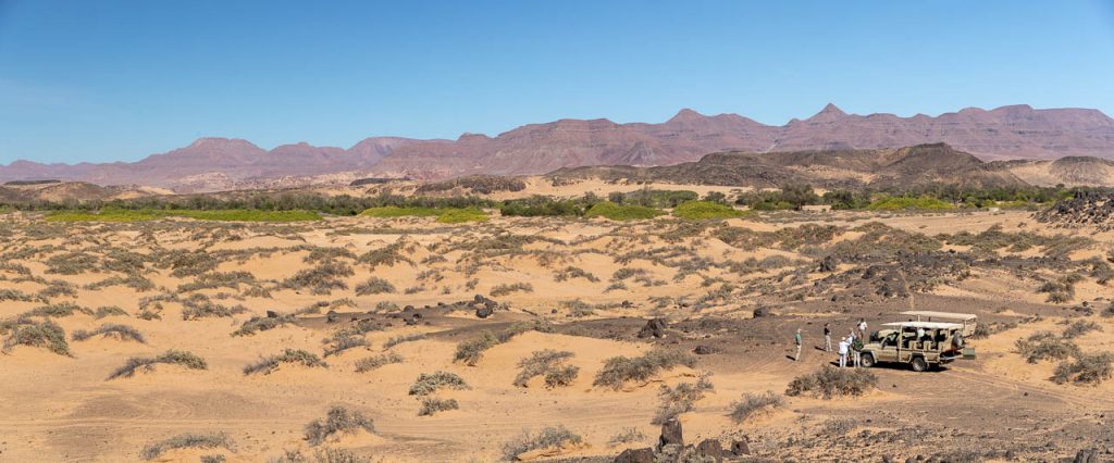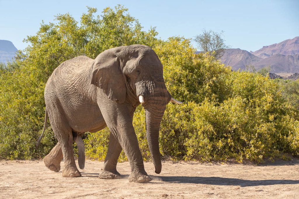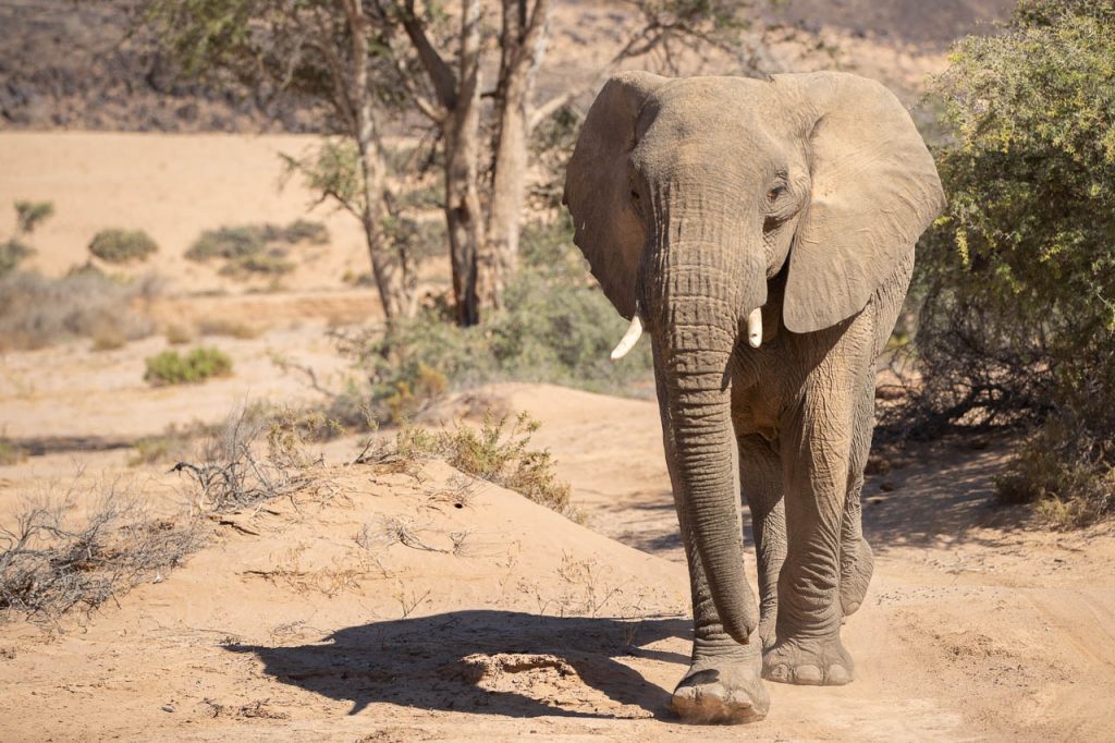 Neben den Felsmalereien kann man in dieser Region ausserdem Elefanten beobachten, die sich an das Klima in der Wüste angepasst haben. Und die Suche nach diesen Wüstenelefanten stand heute auf dem Programm. Die Region wird als “Concession Area” verwaltet, aber es gibt keine Zäune und deshalb können die Elefanten hingehen, wohin sie wollen und sind entsprechend schwieriger zu finden. Zu Hilfe kommt aber die Tatsache, dass Elefanten grosse Tiere sind und entsprechend deutliche Spuren hinterlassen. Kombiniert man das mit der Tatsache, dass sie ausserdem in regelmässigen Abständen an einer Wasserstelle trinken müssen, so hat man die Lösung der Elefanten-Gleichung. Wir wurden aber trotzdem auf eine längere Fahrt eingestimmt und flogen früh morgens bei noch kalten Temperaturen den Elefanten entgegen.