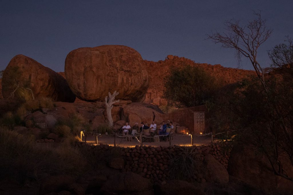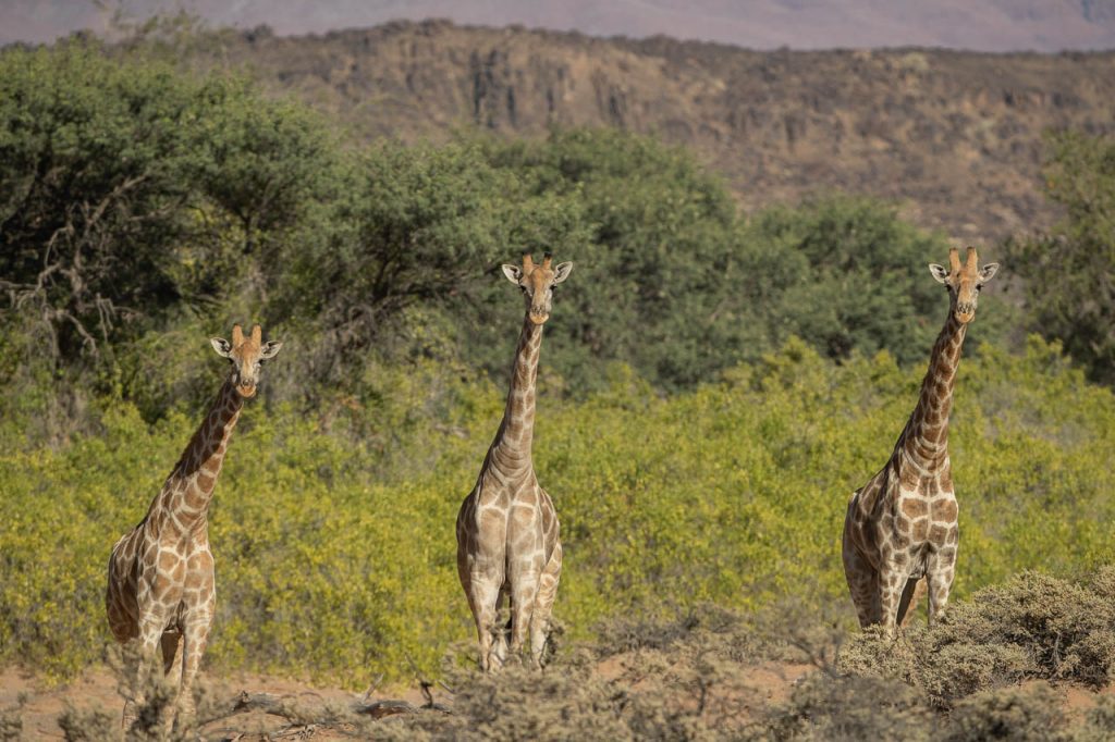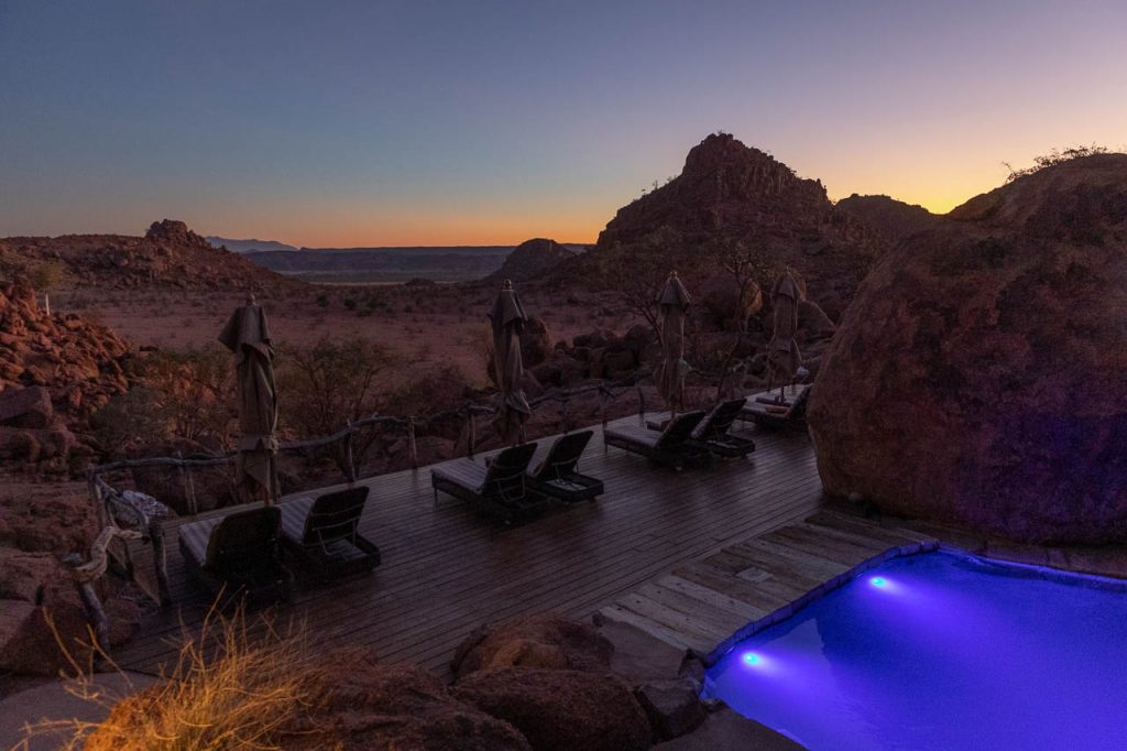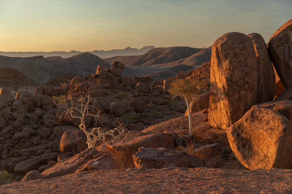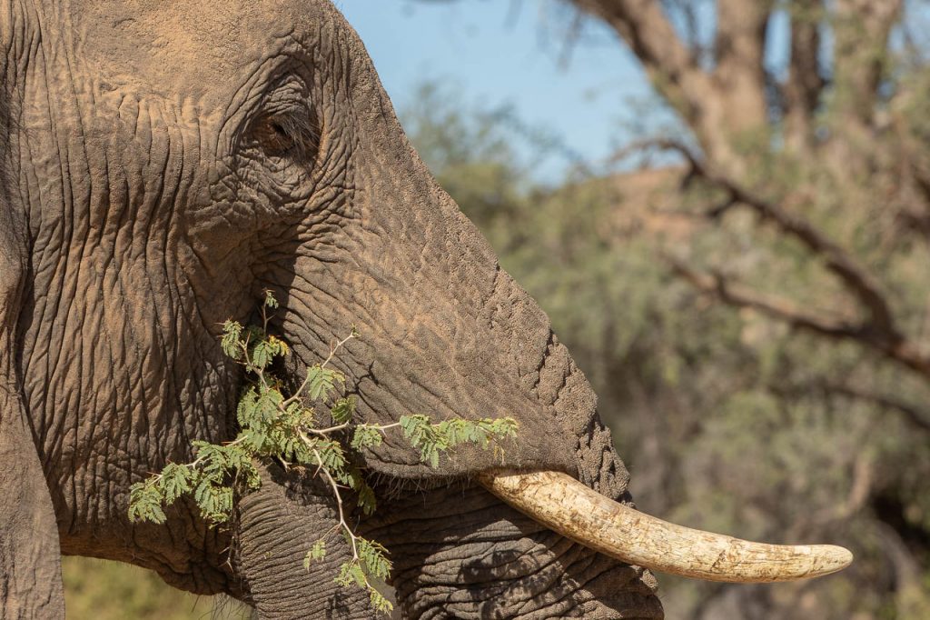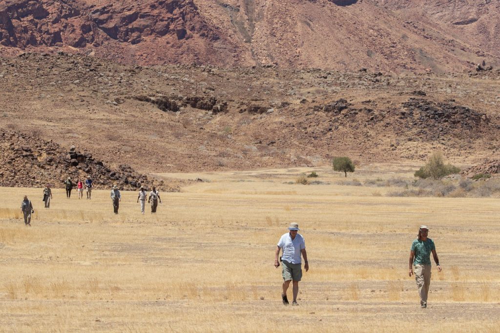 Neben den Felsmalereien kann man in dieser Region ausserdem Elefanten beobachten, die sich an das Klima in der Wüste angepasst haben. Und die Suche nach diesen Wüstenelefanten stand heute auf dem Programm. Die Region wird als “Concession Area” verwaltet, aber es gibt keine Zäune und deshalb können die Elefanten hingehen, wohin sie wollen und sind entsprechend schwieriger zu finden. Zu Hilfe kommt aber die Tatsache, dass Elefanten grosse Tiere sind und entsprechend deutliche Spuren hinterlassen. Kombiniert man das mit der Tatsache, dass sie ausserdem in regelmässigen Abständen an einer Wasserstelle trinken müssen, so hat man die Lösung der Elefanten-Gleichung. Wir wurden aber trotzdem auf eine längere Fahrt eingestimmt und flogen früh morgens bei noch kalten Temperaturen den Elefanten entgegen.