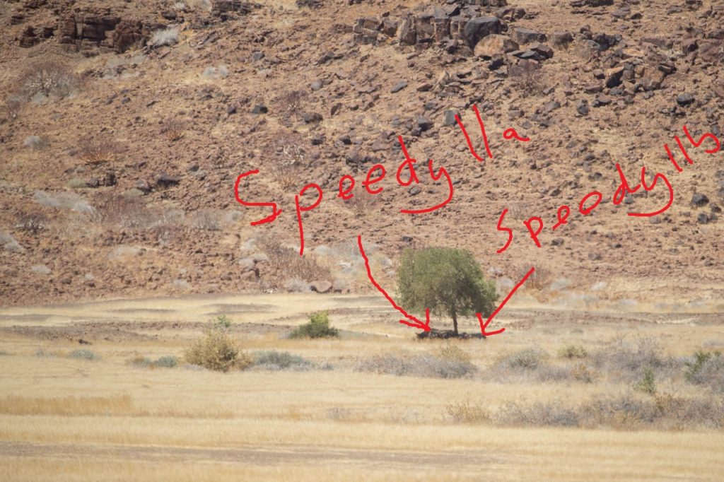 Dabei stiessen wir auf ganz neue Fährten, die eindeutig von Rhinos stammten. Die Rhinos hielten sich zwar nicht an den üblichen Linksverkehr, waren die Fährten doch alle auf der rechten Seite des Weges. Das stört hier aber wirklich niemanden, denn hier gibt es einfach niemanden. Schlussendlich wurden unter einem Baum in etwa 500m Entfernung zwei Ohrenpaare entdeckt. Sie gehörten Speedy IIa und IIb, wie wir bald feststellen konnten.