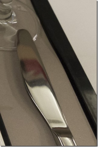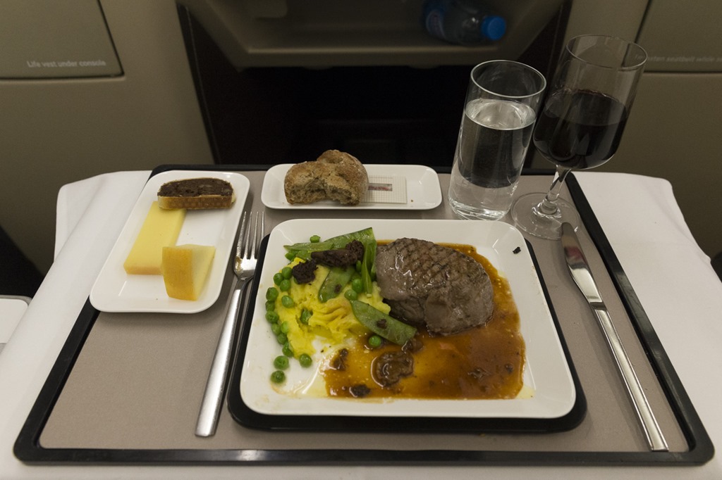 Für den Nachtflug hatten wir uns einen Upgrade gegönnt. So gab es neben dem flachen Bett auch gediegenes Essen. Das Rindsfillet war wirklich sehr gut und zart. Nur das Messer verdiente nicht wirklich seinen Namen: “Es ist nicht alles scharf was glänzt”, frei nach Goethe.  Zu dumm nur, dass mein Sackmesser im Frachtraum war. Ich hatte offenbar nichts gelernt von der Schottischen Episode, dass man immer ein Taschenmesser zu einem Essen mit nimmt (Wir waren einmal in Schottland in einem Schloss an einer vornehmen Runde am Essen und das Messer dort war genau so scharf bzw. stumpf und keiner traute sich damals etwas zu sagen sondern würgte das Fleisch entzwei).