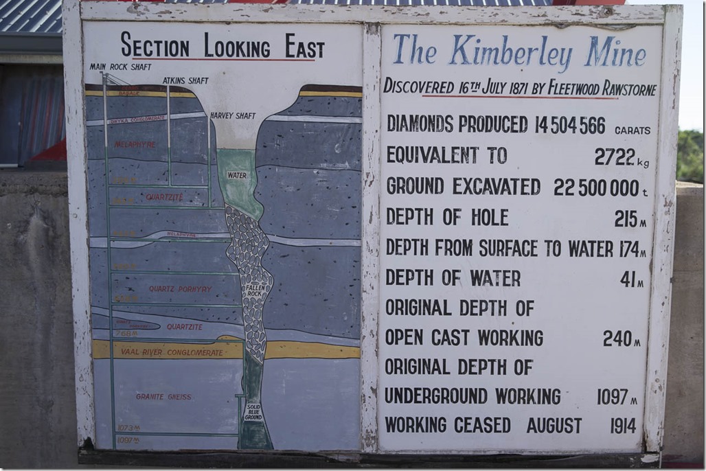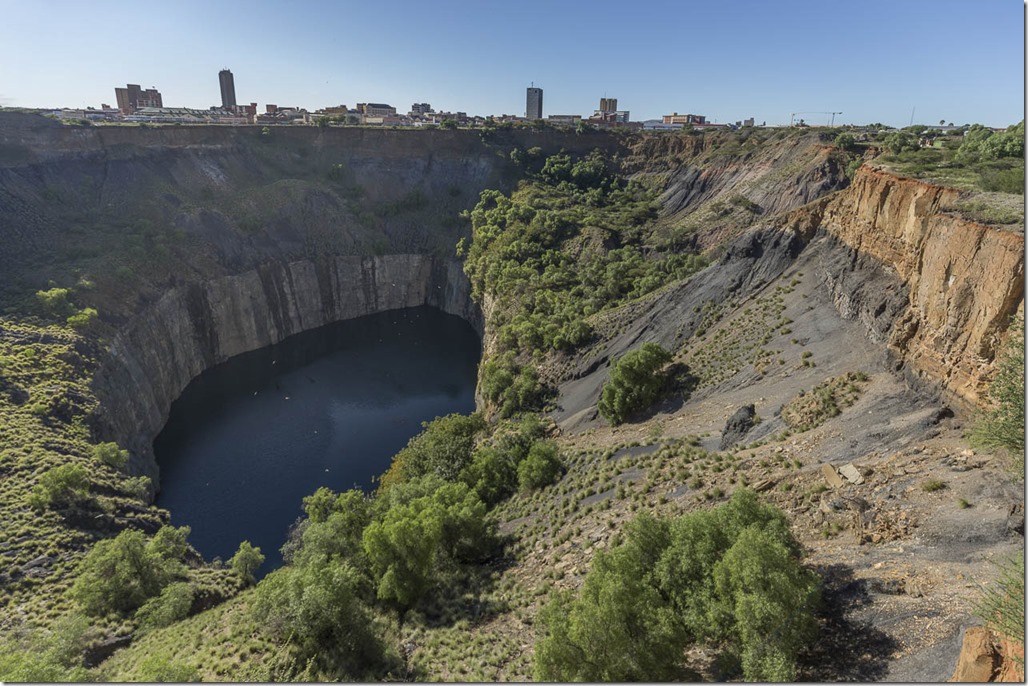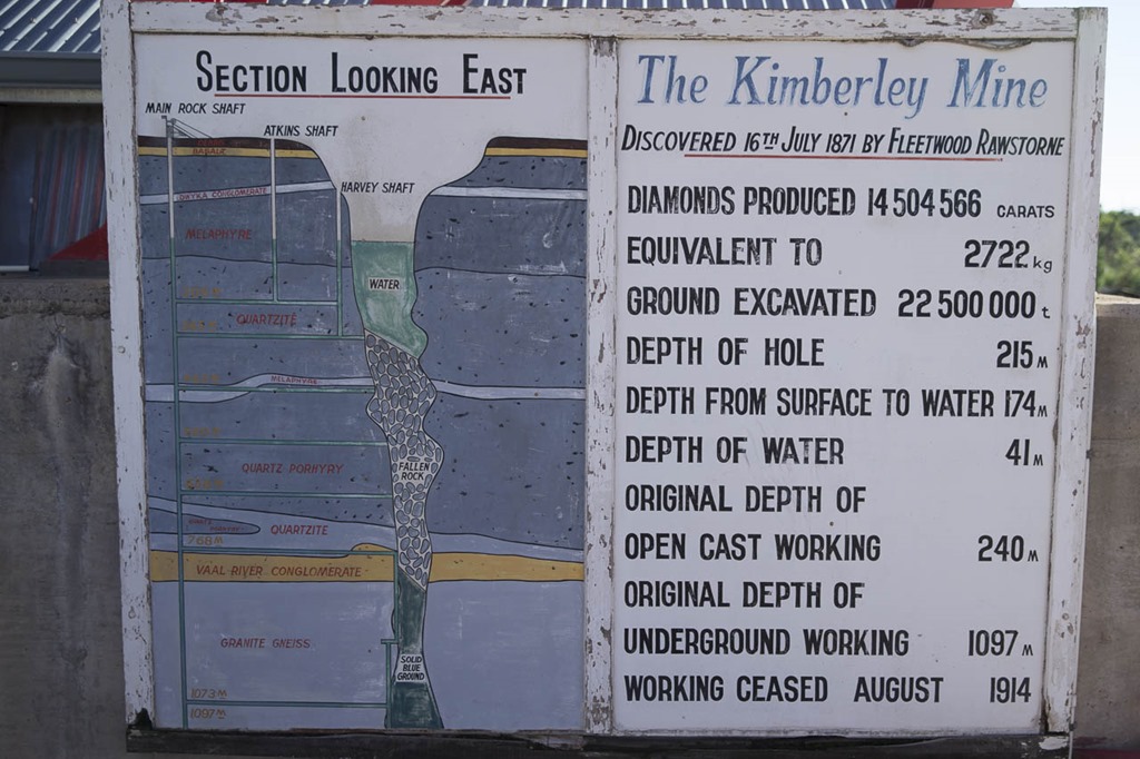 Natürlich wollten wir die wegen der Diamanten bekannte Stadt Kimberly nicht verlassen, ohne vorher das “Big Hole” besucht zu haben. Das Big Hole gilt als eine der größten oberirdischen Minen. Ich hatte auf diversen Fotos schon das Loch gesehen. Es sah nicht sonderlich spektakulär aus. Ein wenig Loch und am Boden etwas Wasser. Wenn man nun aber wirklich davor steht, ist die Grösse sehr eindrücklich. Bis zum See sind es 174 Meter und alles wurde von Hand ausgehoben. Die Daten zur Mine: