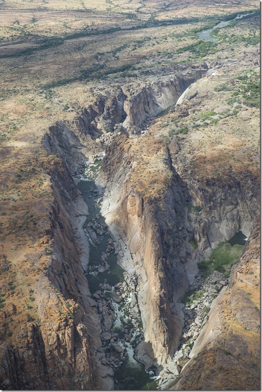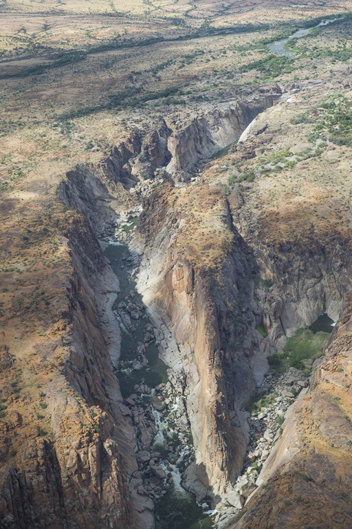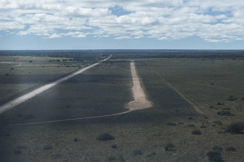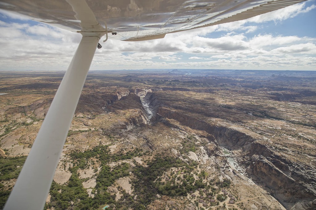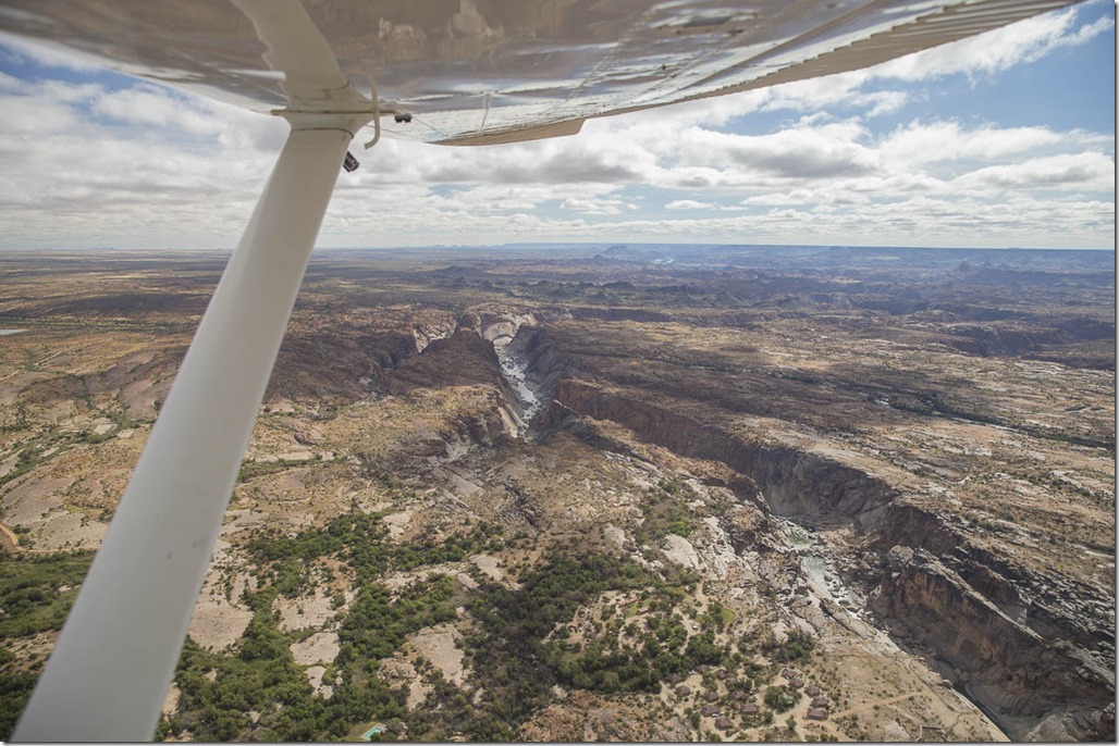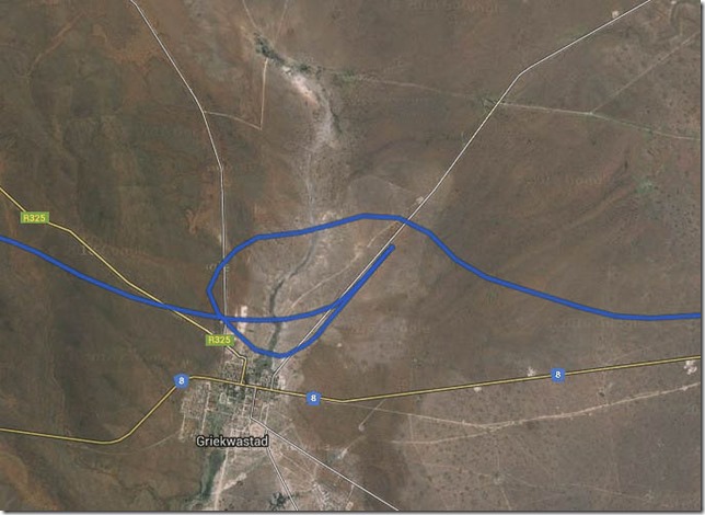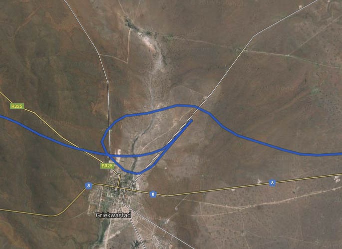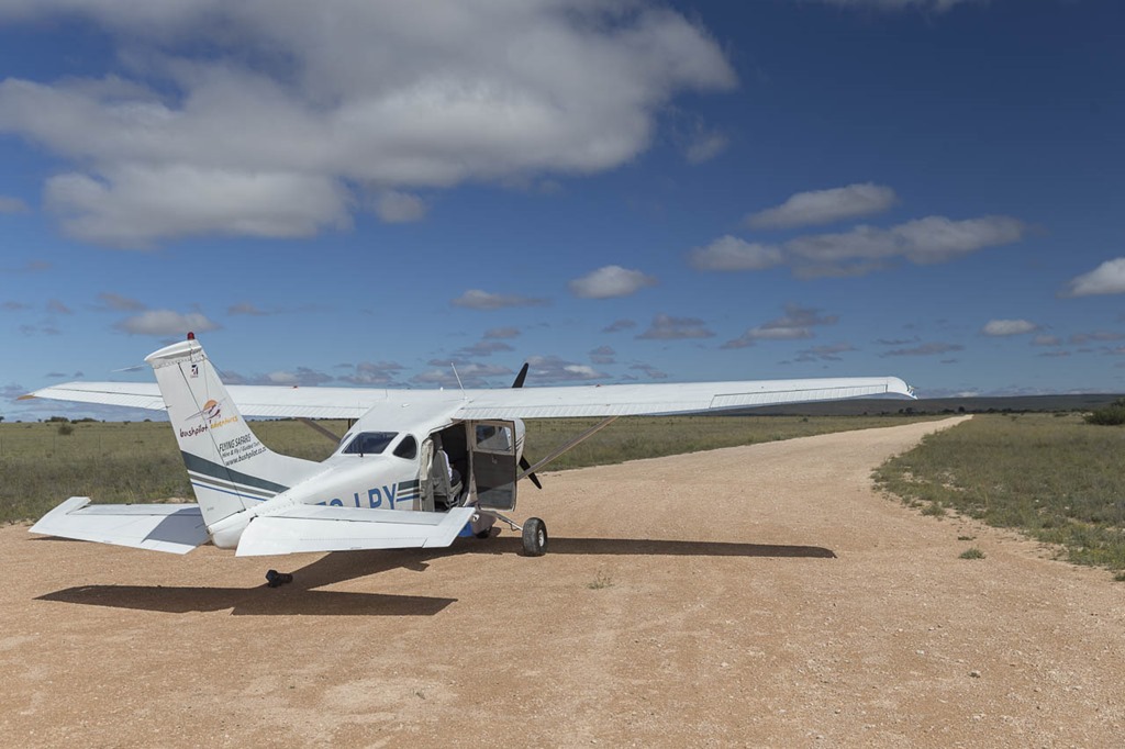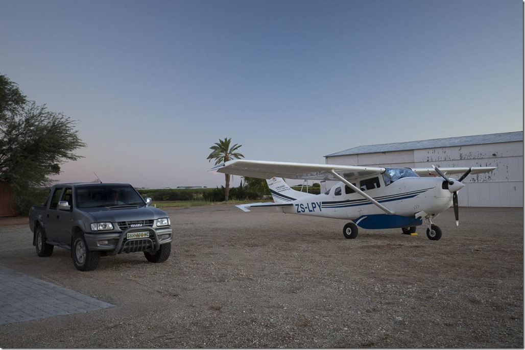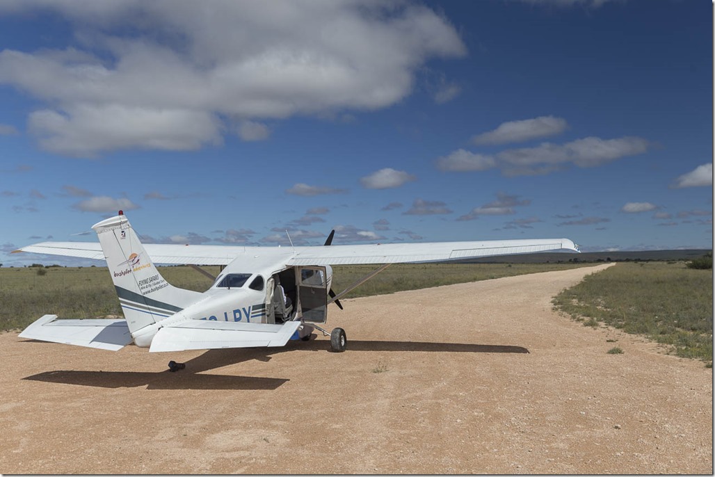 Auf dem Weg zu den Augrabies Falls gab es einen unplanmäßigen Zwischenstopp in Griekwastad, da sich ein Unwohlsein bei gewissen Passagieren eingeschlichen hatte. Wir hatten dafür eigentlich ein anderes Airstrip angepeilt, doch dann tauchte plötzlich unter uns eine viel nähere Alternative auf. Später stellte sich heraus, dass der Airstrip “Tommy’s Field” heisst, zu einer Minengesellschaft gehört und man sich 48 h vorher anmelden sollte …