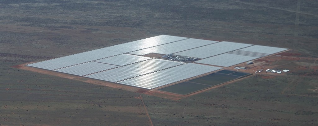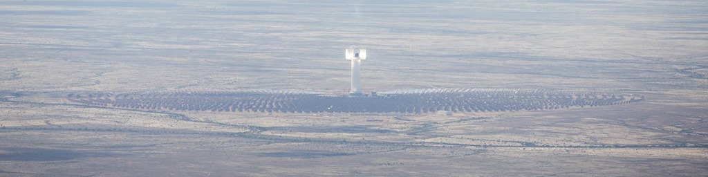 Bei dieser Anlage werden die Strahlen durch Spiegel auf einen Turm umgelenkt. Die leuchtende Spitze ist über eine Distanz von mindestens 100 km deutlich sichtbar.