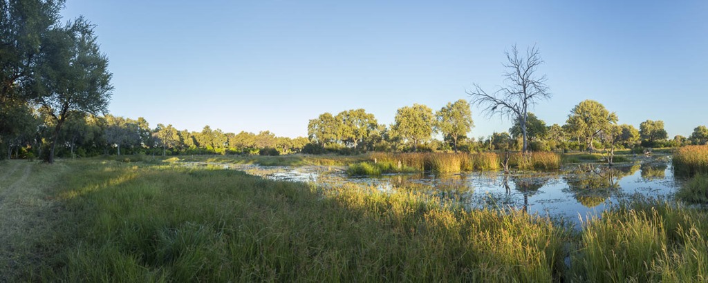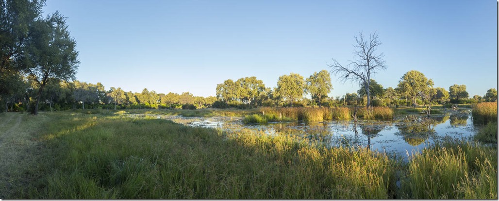 In Khwai ist unser Camp direkt an einem Gewässer. Rechts auf dem folgende Bild sieht man einen Hypo-Pfad. Gesehen haben wir sie hier aber nicht.
