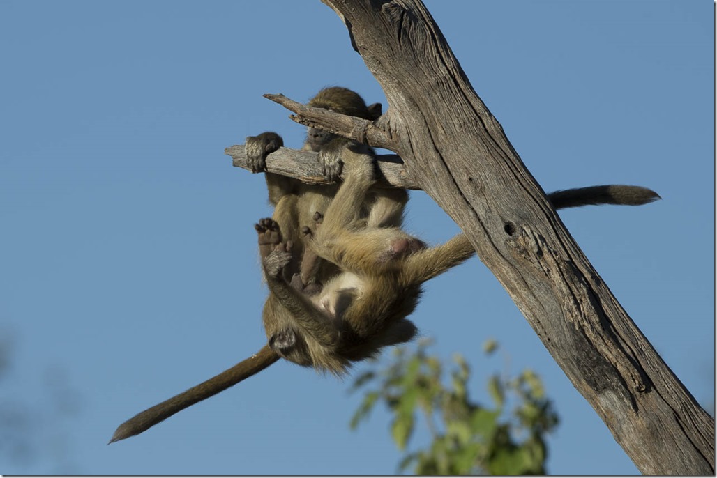 Eine andere Technik, sich nach einer langen Nacht wieder in Schwung zu bringen, ist Morgengymnastik. Es war lustig, den beiden zuzusehen. Sie turnten in allen möglichen und unmöglichen Kombinationen auf dem Baum herum. Eigentlich erwarteten wir, dass das Bündel jederzeit abstürzen könnte, aber irgendwie hatte immer eine Hand oder ein Schwanz etwas umschlugen.