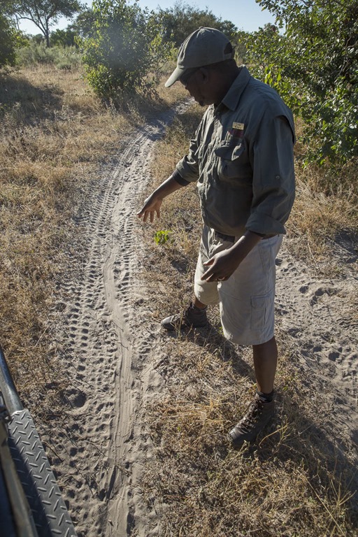 Wenig später stoßen wir auf eine seltsame Schleifspur, die noch sehr neu erscheint, da keine weiteren Spuren darüber liegen. Gee springt aus dem Fahrzeug und mach sich an die Interpretation. Es handelt sich wohl um eine Python, die ebenfalls diesen Weg gewählt hat. Leider biegt sie weniger später ins Dickicht ab und so bekommen wir nicht zu sehen.