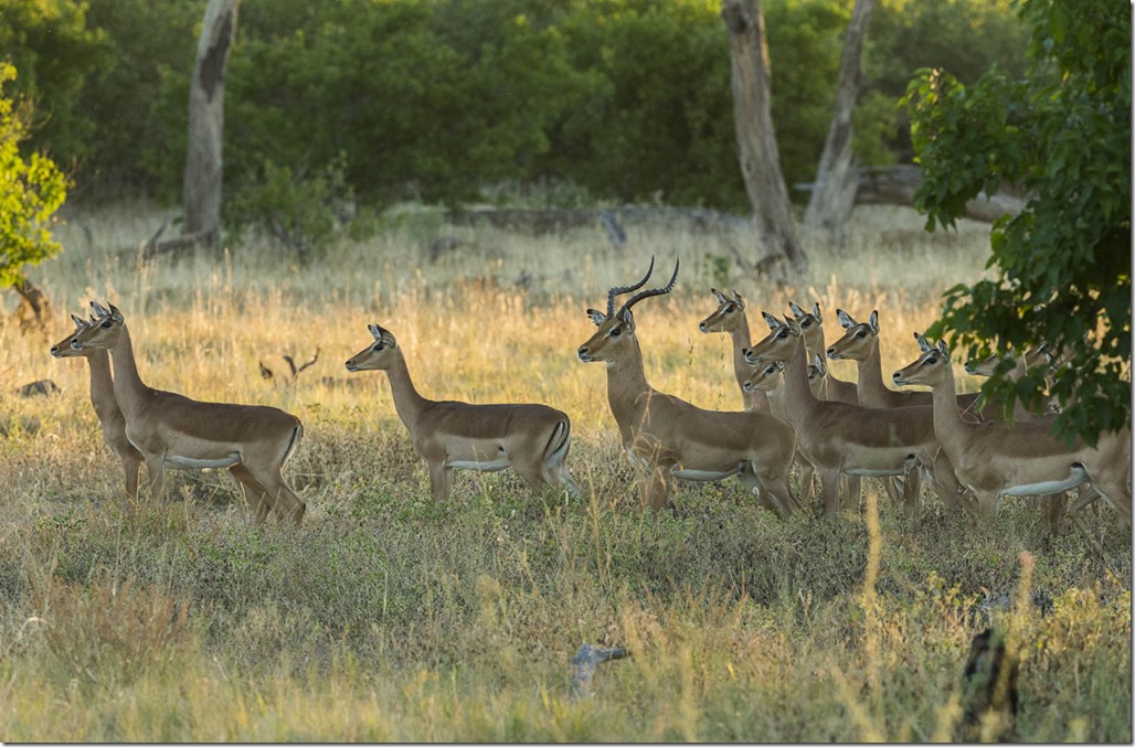 Diese Impalas wollen bestimmt nicht auf dem Teller des Leopard enden und warnen sich gegenseitig mit lauten Warnrufen. Interessanterweise bewegen sie sich in dieser Stellung gleich noch etwas auf den Leopard zu, um ihm zu sagen: “Wir sehen dich, gibt dir keine Mühe, du hast sowieso keine Chance, einen von uns zu fangen”.