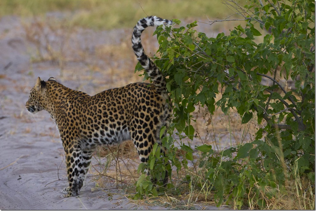 “Gut, war also nichts mit einer leichten Mahlzeit”, muss sich der Leopard gedacht haben, “dann markieren wir eben einfach einmal mein Revier”. In Khwai darf man mit dem Fahrzeug im Gegensatz zu anderen Parks die Raubtiere auch Offroad verfolgen. Wir machten das auch einige Zeit. Doch aufgrund der einbrechenden Nacht, gaben wir das Unterfangen schliesslich auf. “Gin Tonic” stand als nächstes auf dem Programm.