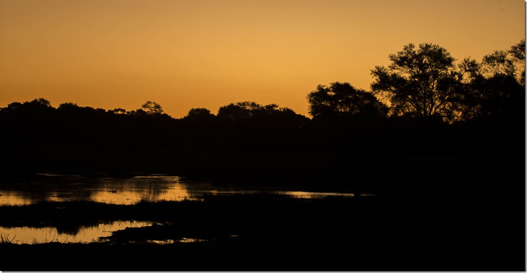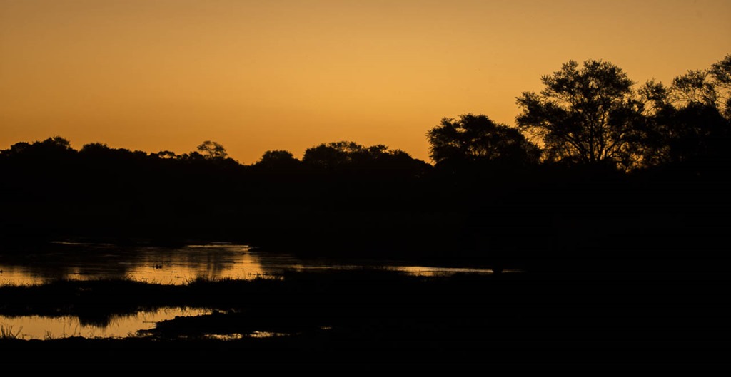 Wieder einmal ein ganz normaler Sonnenuntergang über dem Delta. Fotografisch ist die Stimmung schwer einzufangen, denn die Giraffen auf der einen Seite und die verstreuten Elefanten kommen nicht einfach so auf das Bild. Und auch die “Klingel”-Frösche, die ihre Stimme beim Einbruch der Dämmerung wieder erheben, lassen sich leider nicht festhalten. Tipp: Selber ausprobieren und hierherkommen!