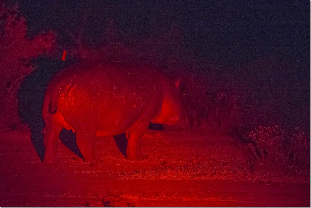 Nachdem es dunkel geworden war, machten wir uns auf die Rückfahrt zum Camp. Dabei setzte unser Guide ein Lampe ein, um die Tiere zu finden. Bei diesem “Night Drive” galt die Aufmerksamkeit nur Tieren, die man am Tag nicht oder nur teilweise sieht. Etwas zu finden ist aber noch schwieriger als am Tag, auch für Gee. Unterwegs versuchten wir auch nochmals, den Leoparden zu finden. Wir waren aber nicht erfolgreich. Es waren auch keine weiteren Warnrufe zu hören, was darauf hindeutete, dass der Leopard mit der Jagt immer noch kein Glück gehabt hatte und wohl die Nacht hungrig verbringen musste. Auf der weiteren Fahrt fanden wir nicht wirklich viele Tiere: eine Eule, irgendetwas Kleines, das wie ein Känguru umherhopst, ein Hase und folgendes Hypo, das im Gegensatz zu Eule sich nicht sofort aus dem Staub macht und deshalb fotografiert werden konnte.