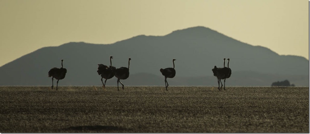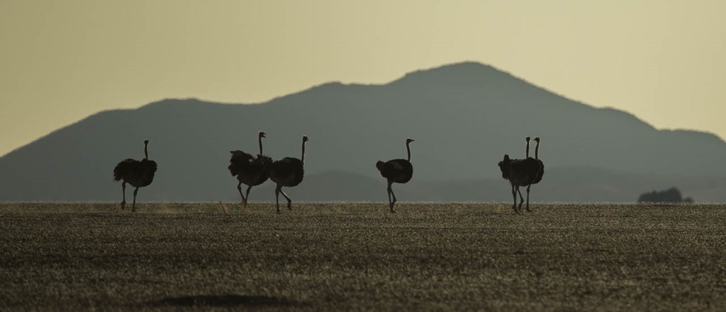 Eine Gruppe Strauße zeigt sich in der Abendsonne.