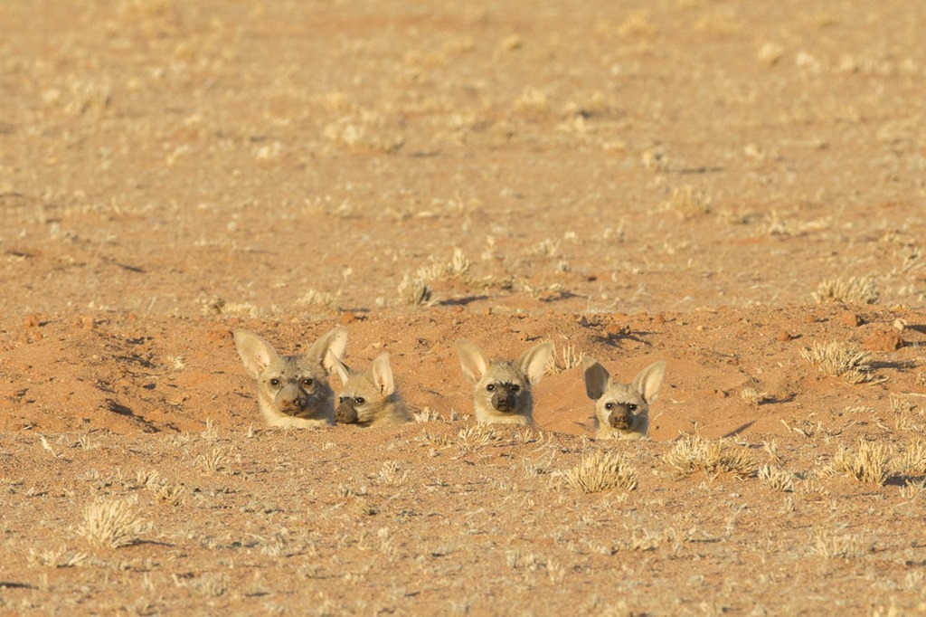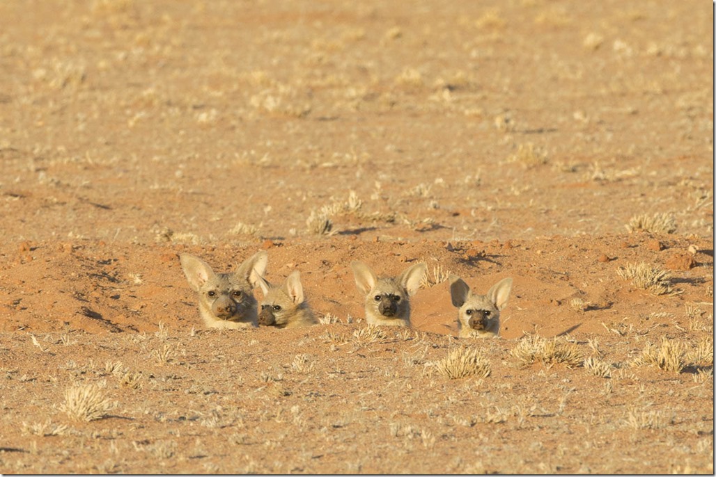 In diesem Teil von Namibia gibt es keine grossen Tiere, einmal abgesehen von 4 Giraffen, die irgendwo im Park verstreut sind und man wegen dessen Grösse von 260000 ha sehr selten sieht. Deshalb liegt der Fokus auf kleinen Tieren. Viele davon verstecken sich gerne in der Erde, wie zum Beispiel diese Erdwölfe. Der Wolf im Namen macht dieses Tier nicht automatisch gefährlich, denn sie fressen hauptsächlich Insekten und kleine Tiere.