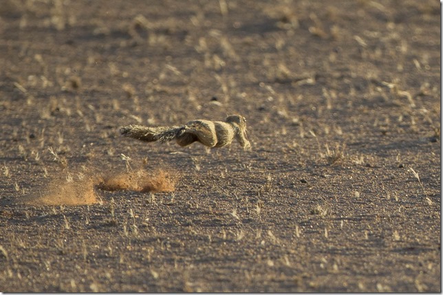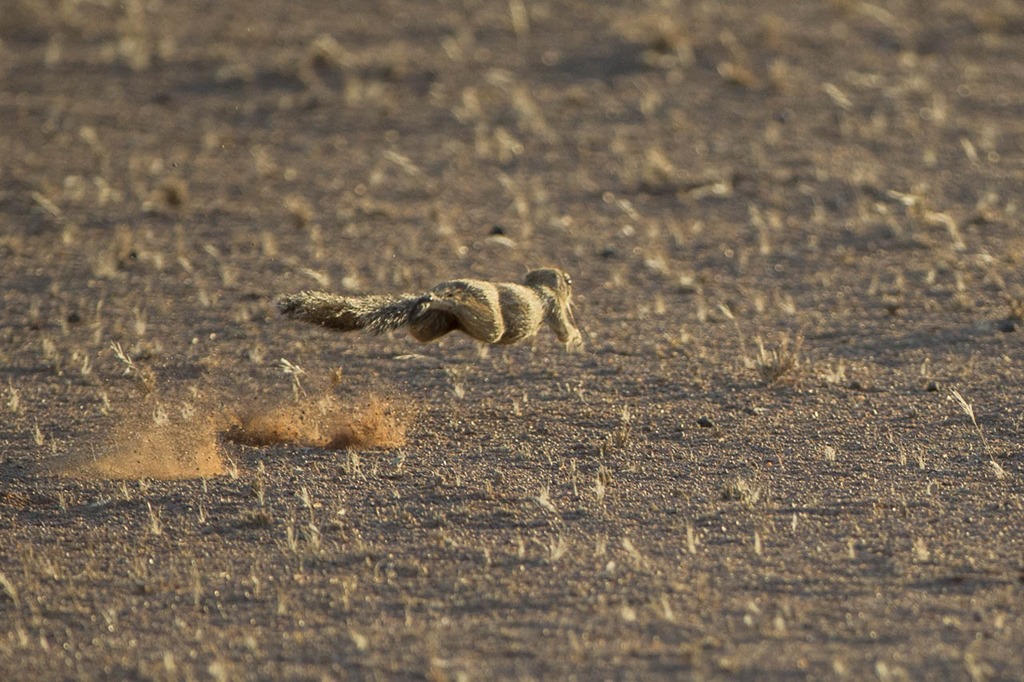 Und hier ein scheues Exemplar der Erdhörnchen, das mit weiten Sätzen die Flucht antritt.