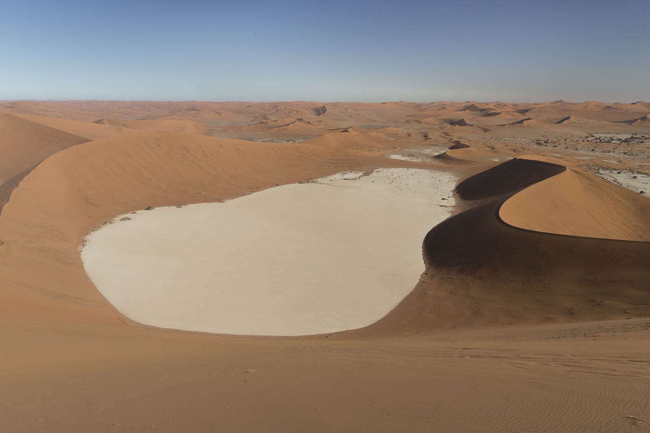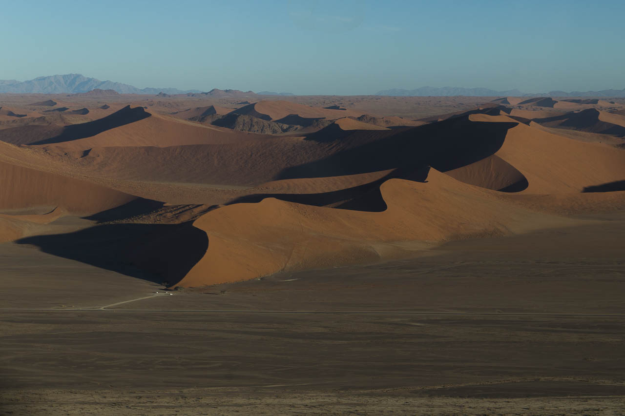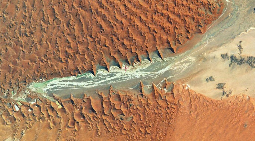 Heute stand der Besuch von Sossusvlei auf dem Programm. Damit man nicht durch die Hitze der Tages gebremst wird, ging es schon um 6 Uhr los. Unsere Lodge, die Kulala Desert Lodge, liegt zwar nicht im Park selbst, hat aber einen eigenen privaten Eingang. So kann man zwar auch erst um 6 Uhr losfahren, hat aber 20 Kilometer Vorsprung auf die Meute, die von Sessriem aus ebenfalls um 06:00 startet. Auf dem folgenden Satelliten-Bild sieht man deutlich, wie sich der Fluss in die Dünen hineinfrisst. In Wirklichkeit war es genau umgekehrt. Der ins Meer fließende Fluss wurde durch die Dünen gestoppt. Es bildete sich ein See. Heute hat der Fluss nur alle paar Jahre ein wenig Wasser. Die erste grosse Düne, die bis fast an die Strasse reicht, heisst Dune 45. Der Name wird von der Tatsache abgeleitet, dass es vom Parkeingang bis dorthin 45 Kilometer sind. Bis ans Ende der Strasse sind es weitere 20 Kilometer. Somit ist die gesamte Fahrt zu dem Dünen etwa 65 Kilometer, die bei offenem Fahrzeug und den teils doch empfindlich frischen Temperaturen am Morgen sehr lange dauern kann. Wir hatten aber das Glück, andere sprechen von geschickter Planung, in einem geschlossenen Landrover unterwegs zu sein. Deshalb blieb die Daunenjacke auch zu hause.