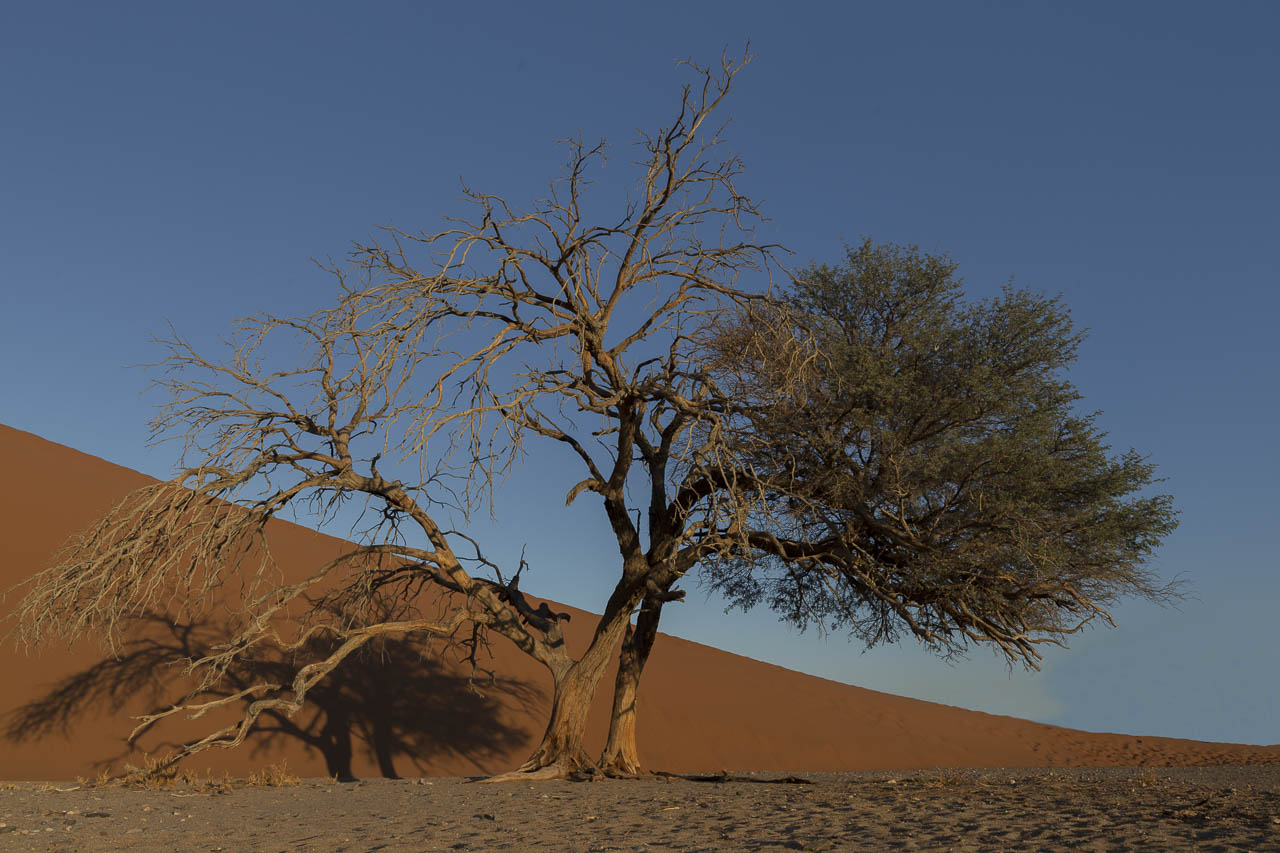 Die Dünen in dieser Region sind eigentlich alle praktisch stationär, da sich der Untergrund stark verfestigt, sprich versteinert hat. So hat auch der Baum im folgenden Bild eine Zukunft. Einzig die Trockenheit könnte ihm einen Strich durch die Rechnung machen.