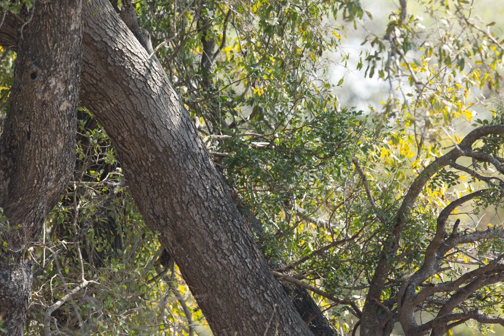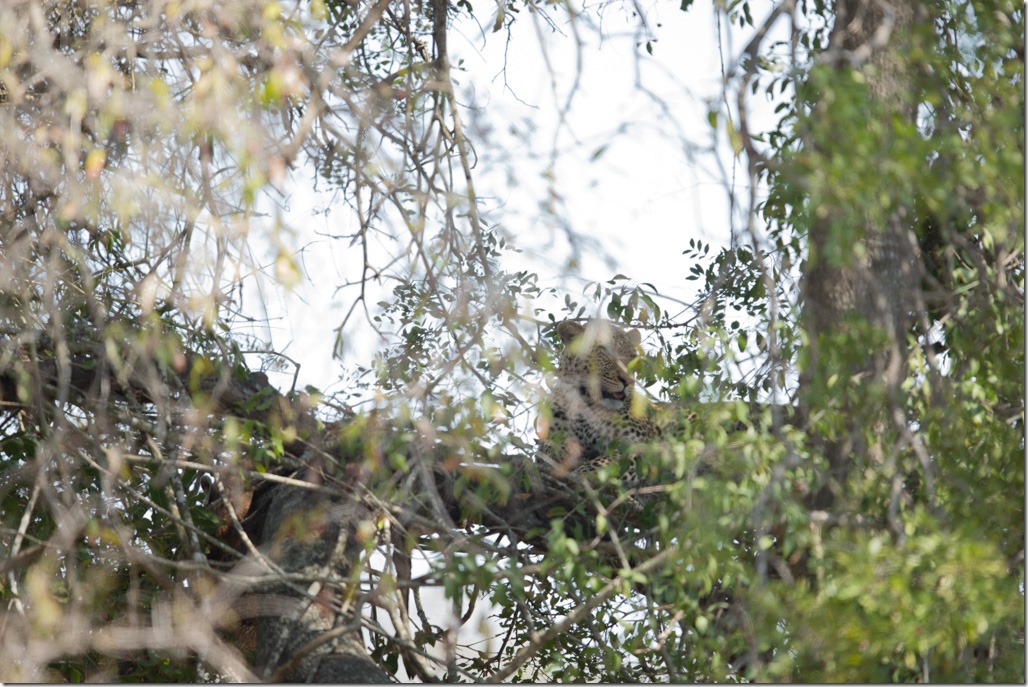 Als wir am Ort ankamen wurde die Freude aber etwas gedämpft. Leoparden schlafen, ruhen, selbst fressen auf Bäumen, nachdem sie ihre Beute dorthin hochgezogen haben. Und dieses Exemplar hatte sich denjenigen Baum in Umkreis von 40 Kilometer ausgesucht, der definitiv das dichteste Laubwerk hatte.