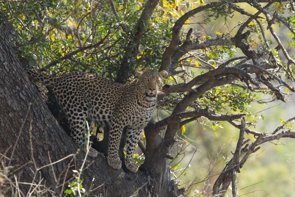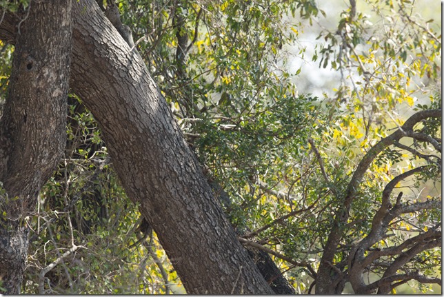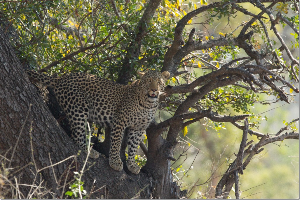 Jetzt gab es zwei Möglichkeiten: Er geht trinken und kehrt wieder auf dem Baum zurück oder wir sehen ihn nie wieder. Ersteres findet aber nur statt, wenn er auf dem Baum auch eine Beute zu fressen versteckt hat. Das konnten wir aber wegen des dicken Buschwerks nicht sehen. Normalerweise dauert das Trinken gegen 30 Minuten bis ein Leopard wieder zurückkehrt. Solange warteten wir auch noch für ein Auf-den-Baum-Kletter-Foto. Dann beschlossen wir weiter nach Süden zu fahren. Wir waren gerade am Wegrollen und natürlich nicht mehr in Position, da kehrte der Leopard auf den Baum zurück. Pech gehabt, aber so geht das mit Naturfotografie …