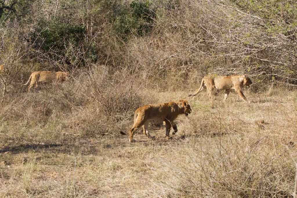 Wir waren schon auf der Rückfahrt Richtung Camp als plötzlich am Strassenrand die Hölle los war. Überall Warnrufe von Vögel und Affen. Irgendwelche Impalas die verstört hin und hersprangen. Bald war auch der Grund dafür ausgemacht. Ein Rudel von 14 (!) Löwen war gerade bei der Jagd. Lautlos “schwebten” sie durch das Dickicht. Leider drehten sie ihre Rute bald von der Strasse weg in ein Flussbett, sodass der weitere Verlauf der Jagt von uns leider nicht mehr beobachtet werden konnte. Mir ist aber schleierhaft, was es bringt, wenn 14 Löwen Impalas jagen. Da bleibt jedem nur ein Bissen. Sinn macht so etwas nur bei Giraffen oder Büffeln.