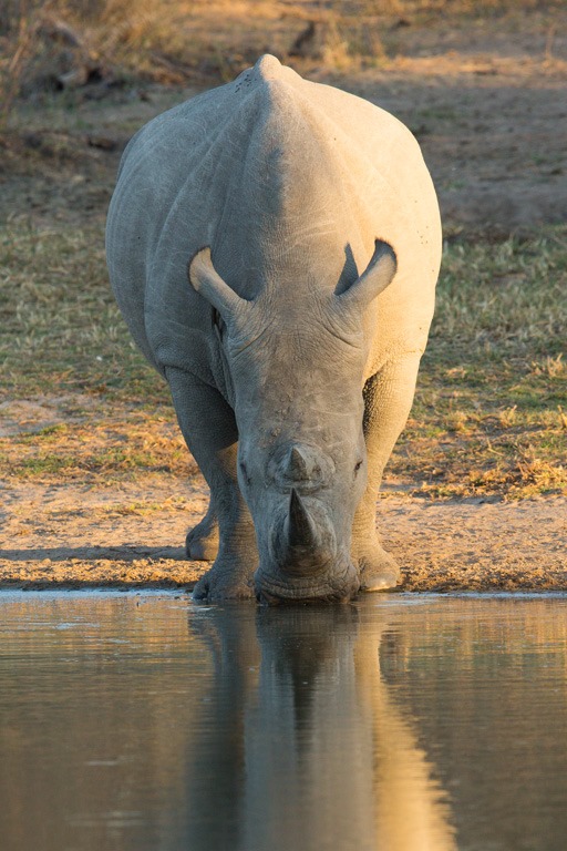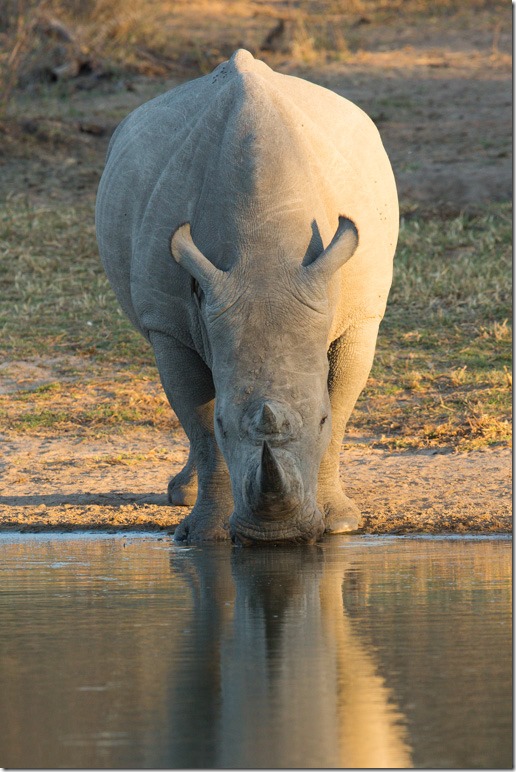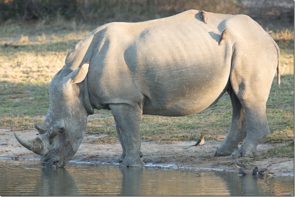 Schlussendlich kam auch noch ein Rhino zu Wasserloch. Ein mächtiges Teil, das bis 2 Tonnen schwer werden kann. Die Lebenserwartung von Rhinos liegt übrigens bei 45 Jahren. Man kann also gut mehrmals das gleiche sehen wenn man wieder kommt.