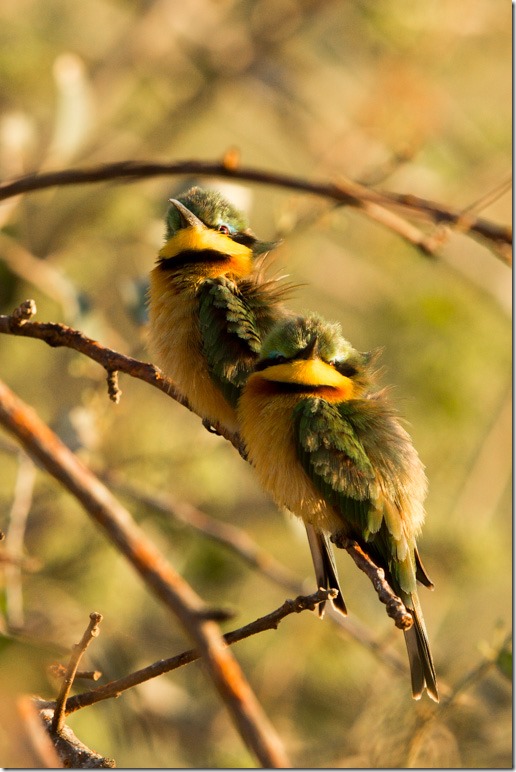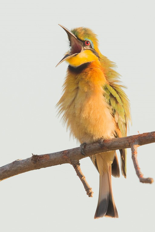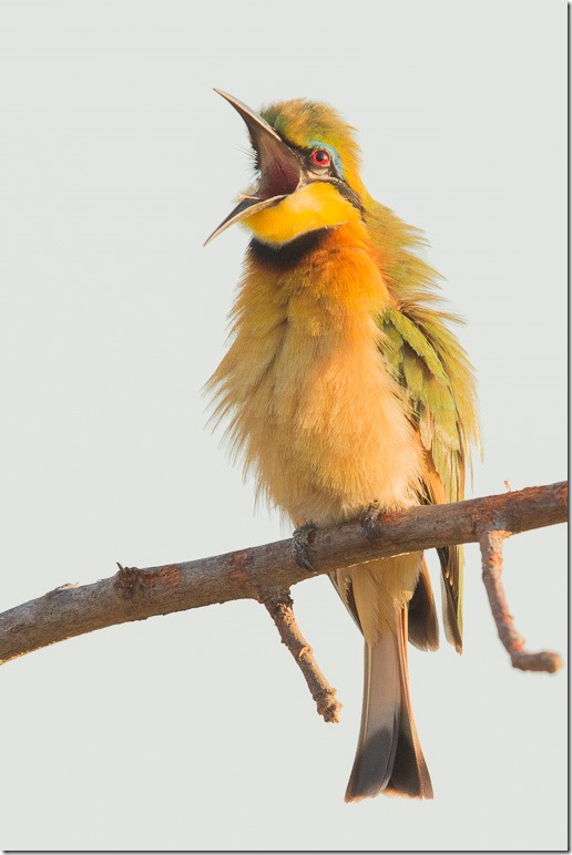Im ersten Morgenlicht konnten wir einen beziehungsweise eine ganze Gruppe von “Little Bee Eater” – “Kleine Bienen Fresser” fotografieren. Deutsch heisst das kleine Ding “Zwergspint”, total logisch?!?! Kämmen wäre auch einmal angesagt.