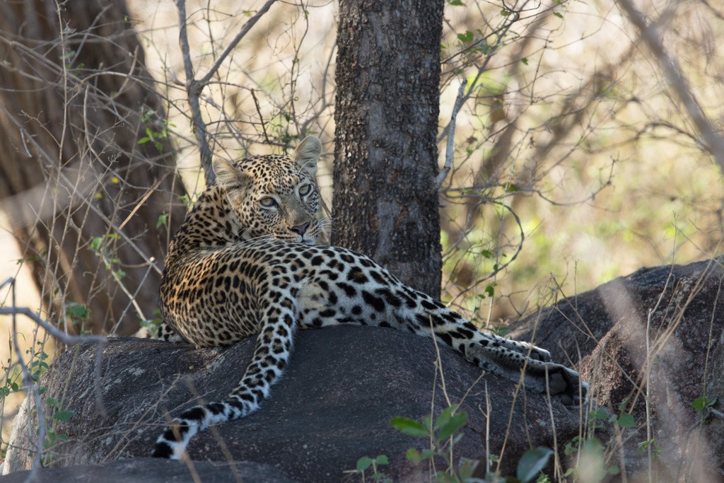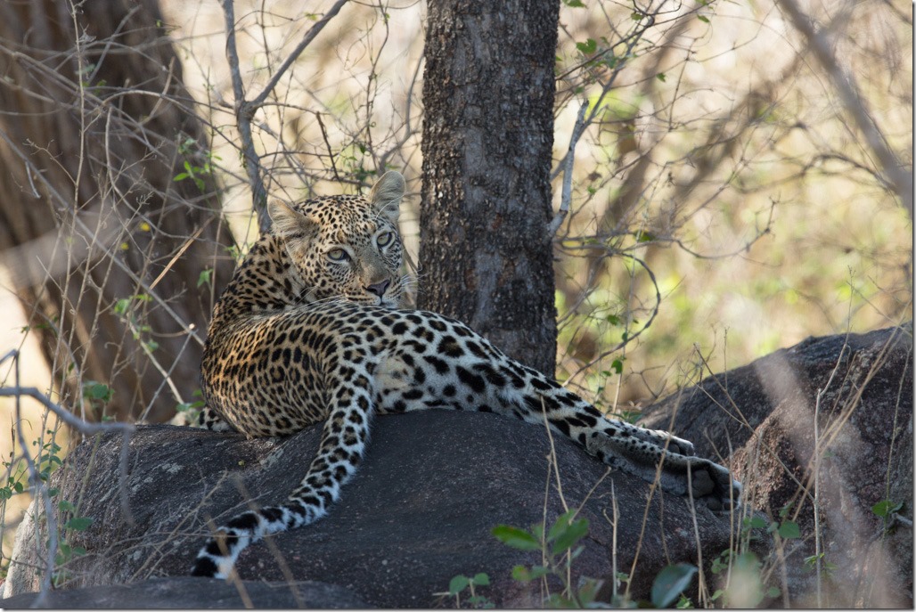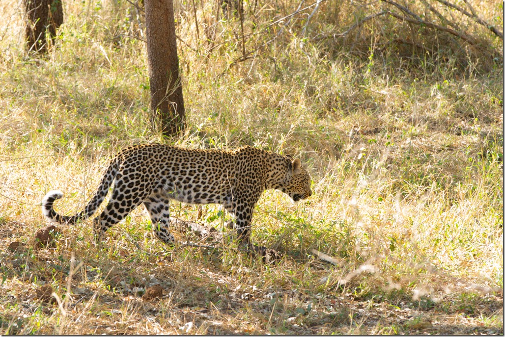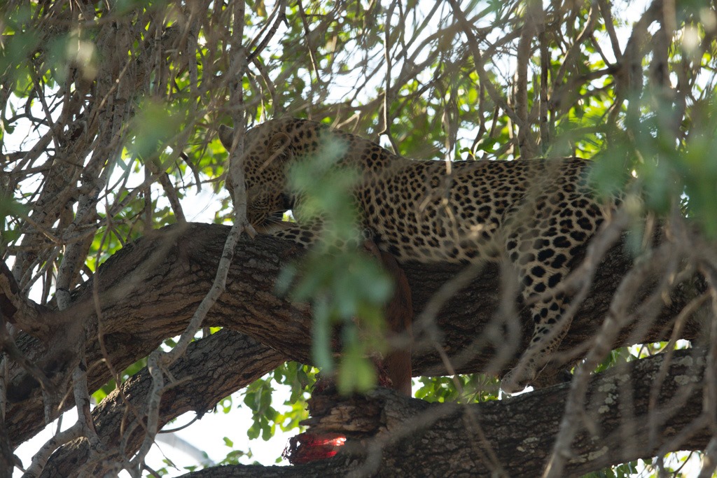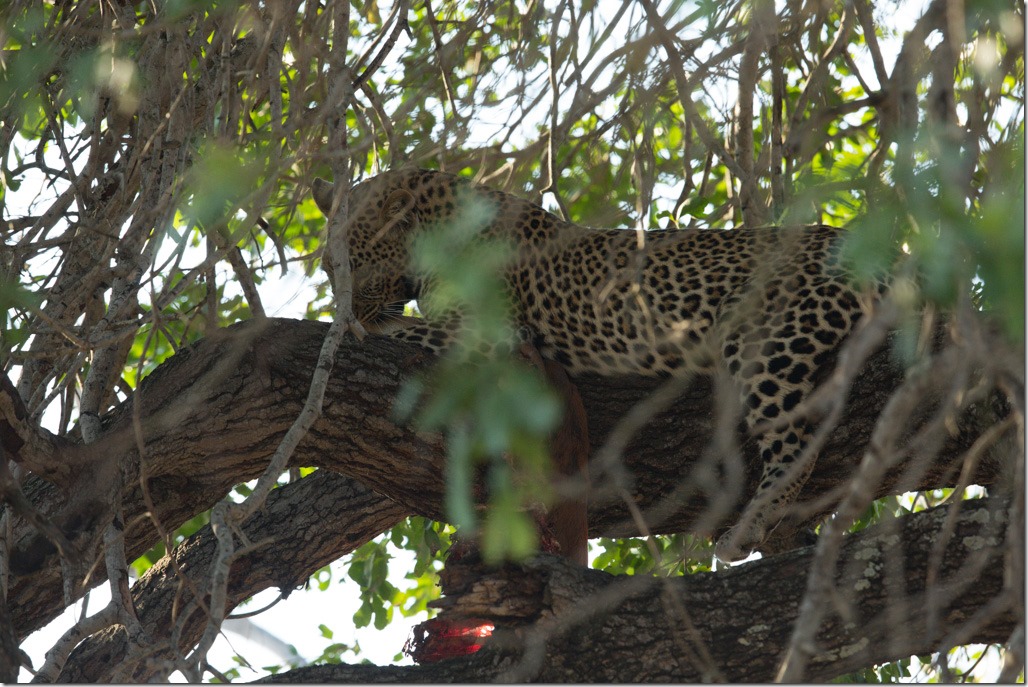 Also nächstes war Mr. oder Mrs. Leopard an der Reihe. Das kennen wir doch schon. Man wartet bei den Leoparden Stunden für das perfekte Foto und dann geht es trotzdem schief. Da wir dieses Mal die Entdeckung selber gemacht haben, war sonst noch niemand da. Auch war der Ort auf einer unbefestigten Nebenstrasse und so konnte man hoffen, dass bald nicht ein Verkehrschaos entstehen würde. Der Leopard war gerade daran, die letzten Happen von einem zuvor gerissenen Impala zu verspeisen. Leoparden schleppen übrigens ihre Beute, die bis 70 kg schwer sein kann, immer auf Bäume um sie vor anderen Raubtieren zu verstecken. Dann Fressen sie daran über mehrere Tage.
