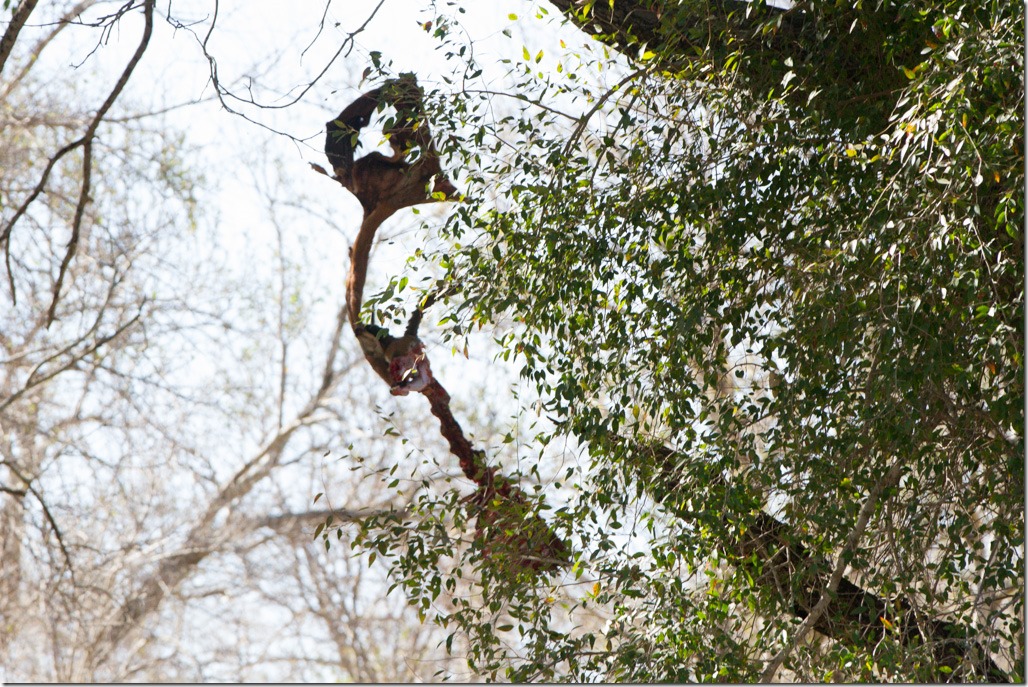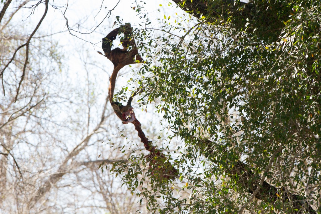 Im schlauen Buch steht über Leoparden , dass sie 45 Minuten fressen, dann vom Baum steigen und für bis zu 30 Minuten trinken gehen. Schlaues Buch sagte ich? Wir warteten gegen zwei Stunden, bis das Fressen beendet war! Soviel zu schlauen Büchern. Da er offensichtlich alles aufgefressen hatte, liess der Leopard anschliessend den Rest vom Impala Männchen auf den Boden fallen. In der Mitte sieht man den Kopf mit Geweih, darunter die Wirbelsäule und darüber die Haut … Guten Appetit für die, die gleich essen wollen Smile