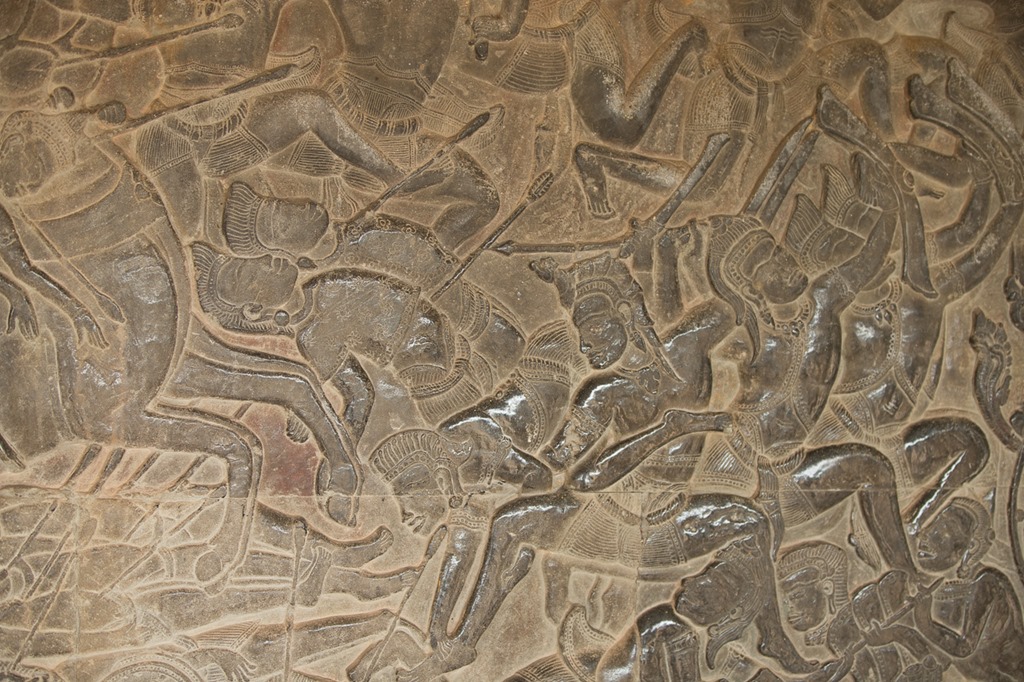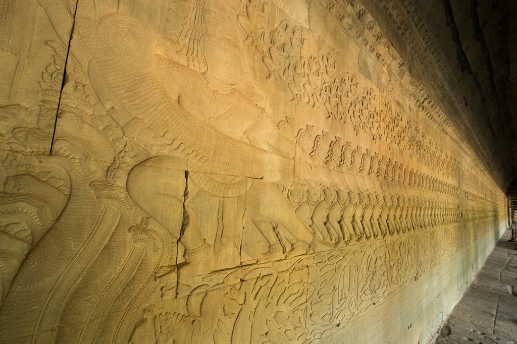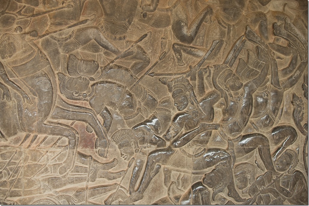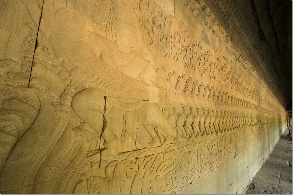 Viele Wände sind mit Figuren verziert, die irgendwelche hinduistischen Sagen beschreiben. Im folgenden Bild sieht man das „Quirlen des Milchozeans“, bei dem die Götter auf der einen und die Dämonen auf der anderen Seite an einer Schlange ziehen, die um einen Berg gewickelt ist, um damit das Meer aufzuwühlen und den Unsterblichkeitstrank zu erzeugen. Die ganze Szene ist gegen 50 Meter lang. Und das ist nicht einmal die Hälfte einer Seite des inneren Tempels.