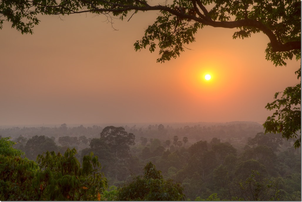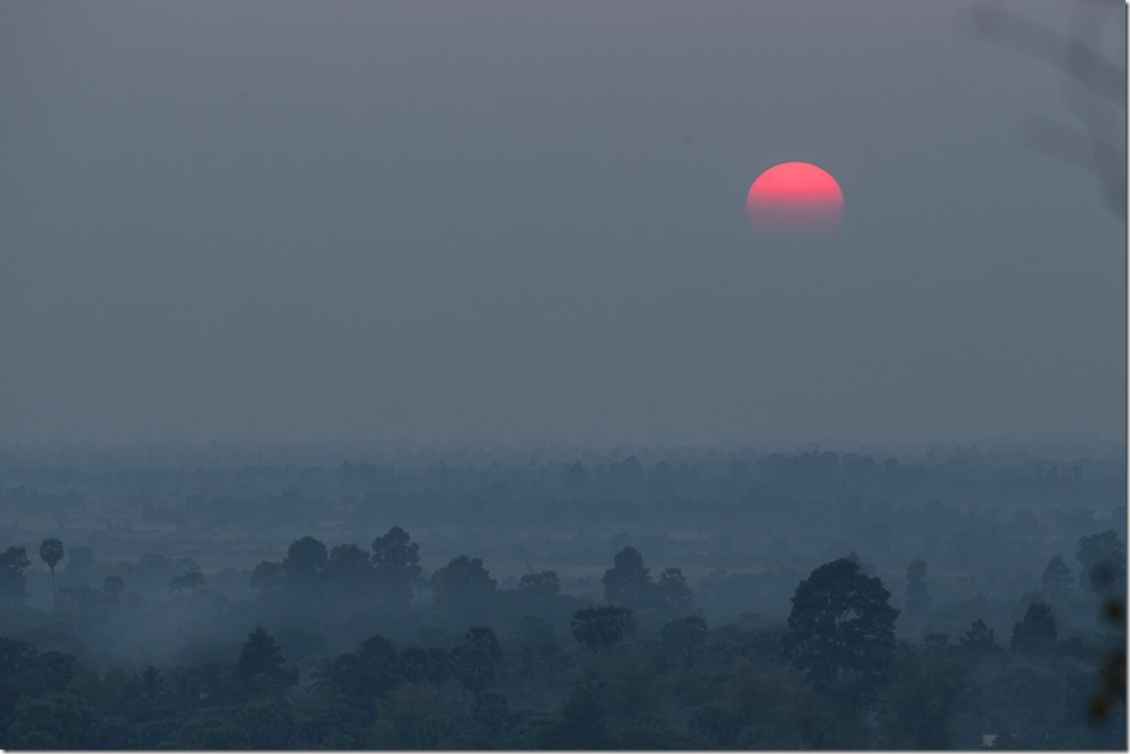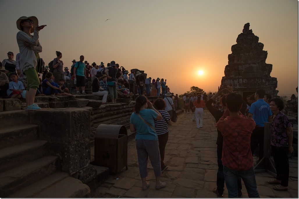Der Versuch, nach dem Sonnenaufgang heute auch den Sonnenuntergang zu beobachten, wurde durch die Tatsache zunichte gemacht, dass die Tempelanlagen genau um 17:30 schliessen. Nicht eine Minute vorher und nicht eine danach. Also konnten wir nicht auf den Phnom Bakheng Tempel steigen, sondern mussten von einer Aussichtsplatform darunter den Sonnenuntergang beobachten. Schön war es aber trotzdem.