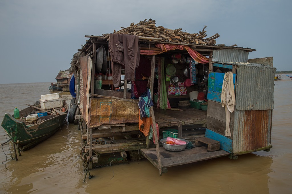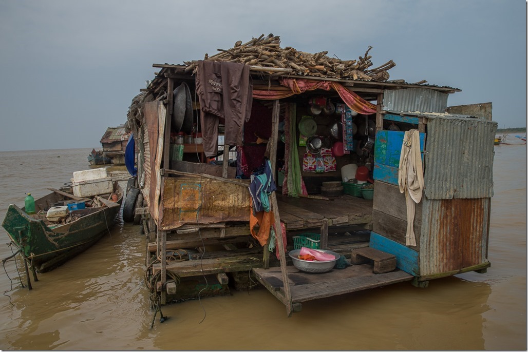 Schwimmendes Haus. Zu sehen die Küche und das WC(?). Die Häuser werden je nach Jahreszeit und Wasserstand verschoben. In der Regenzeit kann der Spiegel bis zu 8 Meter steigen, dies auch darum, da der Abfluss, der Tonle Sap Fluss, in der Regenzeit seine Flussrichtung (wegen des Mekongs) umkehrt und wieder zurück in den See fliesst.