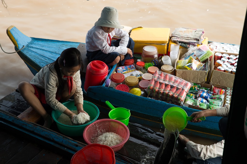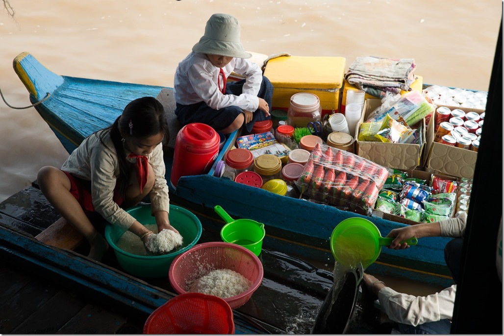In der Schule bekommen die Kinder auch gleich das Mittagessen. Hier wurde unser Reis gleich gewaschen. Wasser hat es ja genug, welcher Effekt damit genau erzielt werden soll, ist mir in Anbetracht der Wasserqualität aber ein Rätsel. Auf dem Bild sieht man ausserdem einen mobilen Boots-Laden. Sehr praktisch, falls man noch etwas vergessen hat fürs Kochen.