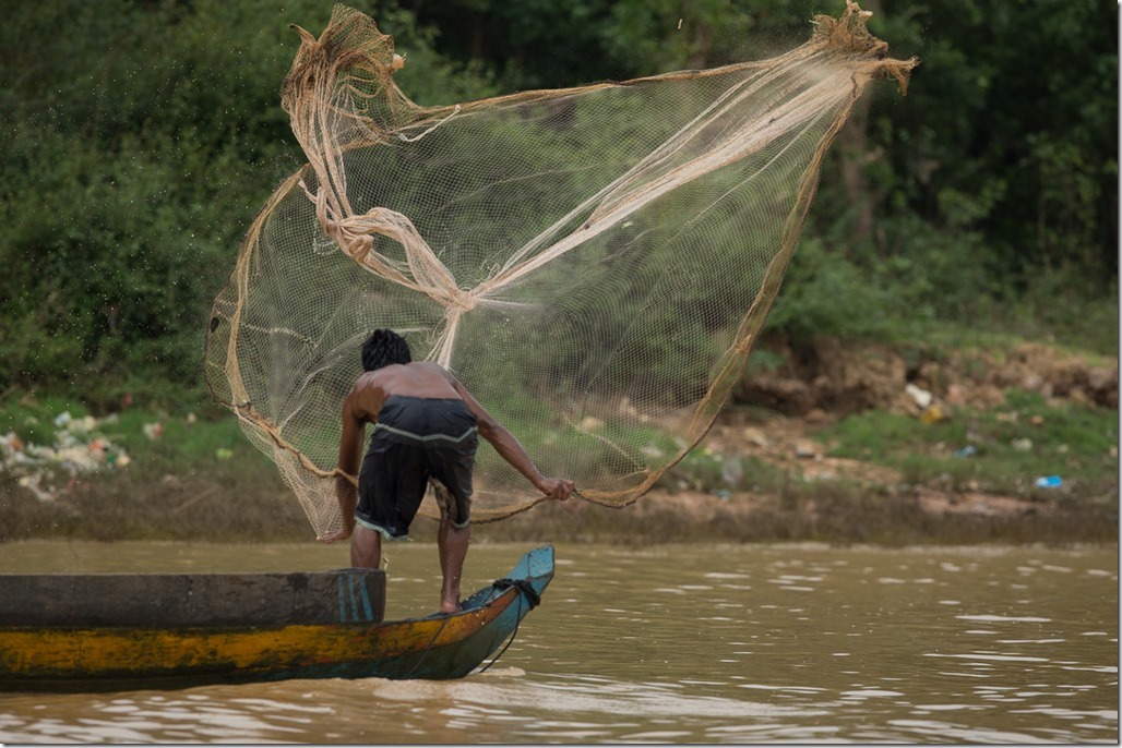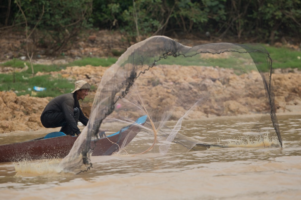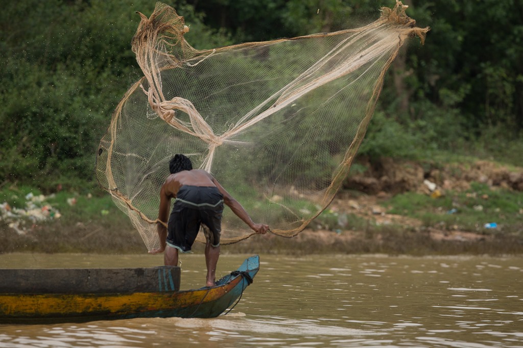 Bei dieser Technik werfen sie das Netz aus, das aufgrund von Gewichten am Rand sofort absinkt und so die Fische gefangen werden.