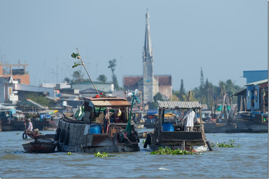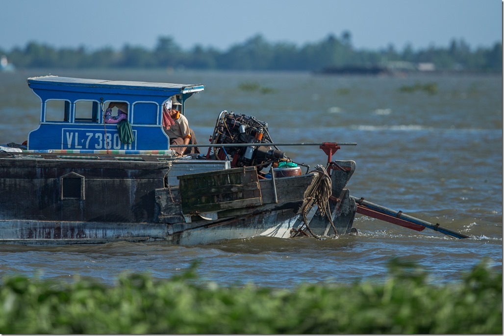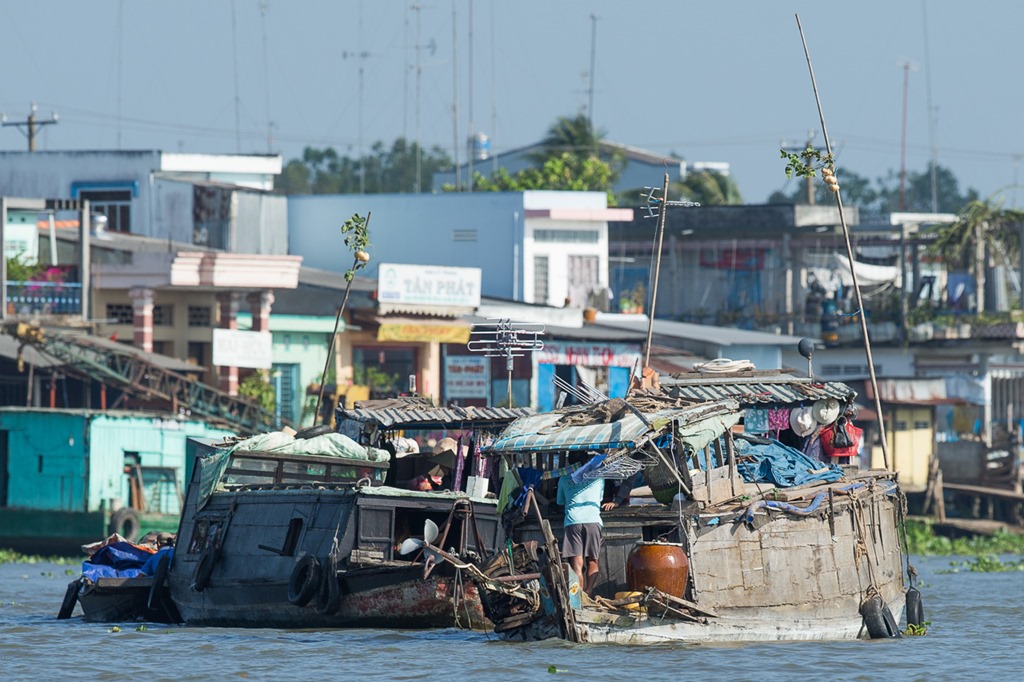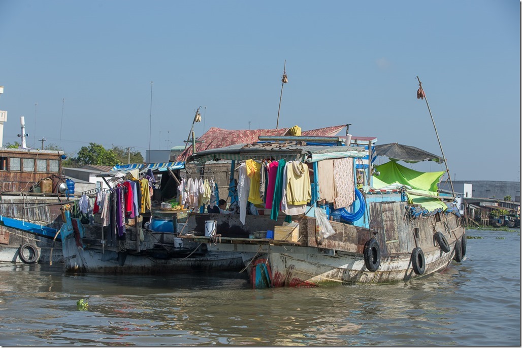 Danach ging es Richtung dem schwimmenden Markt von Cai Be. Wir waren aber entweder zu spät, oder der Markt hier ist nicht wirklich ausgeprägt. Denn es gab nicht viele kleinen Boote. Die Mehrzahl der Boote waren grössere Hausboote, die hier geankert hatten. Man beachte die Antenne für den Fernsehempfang.