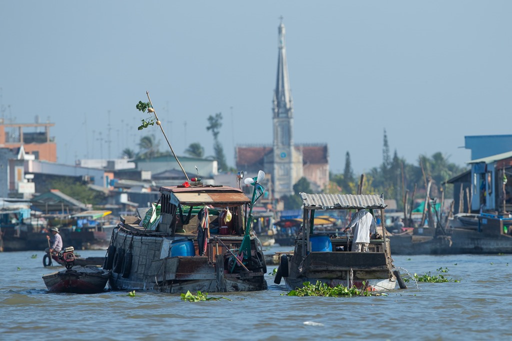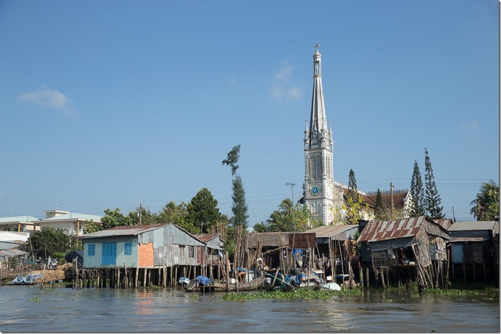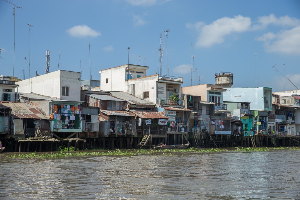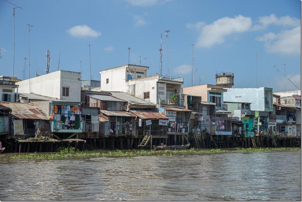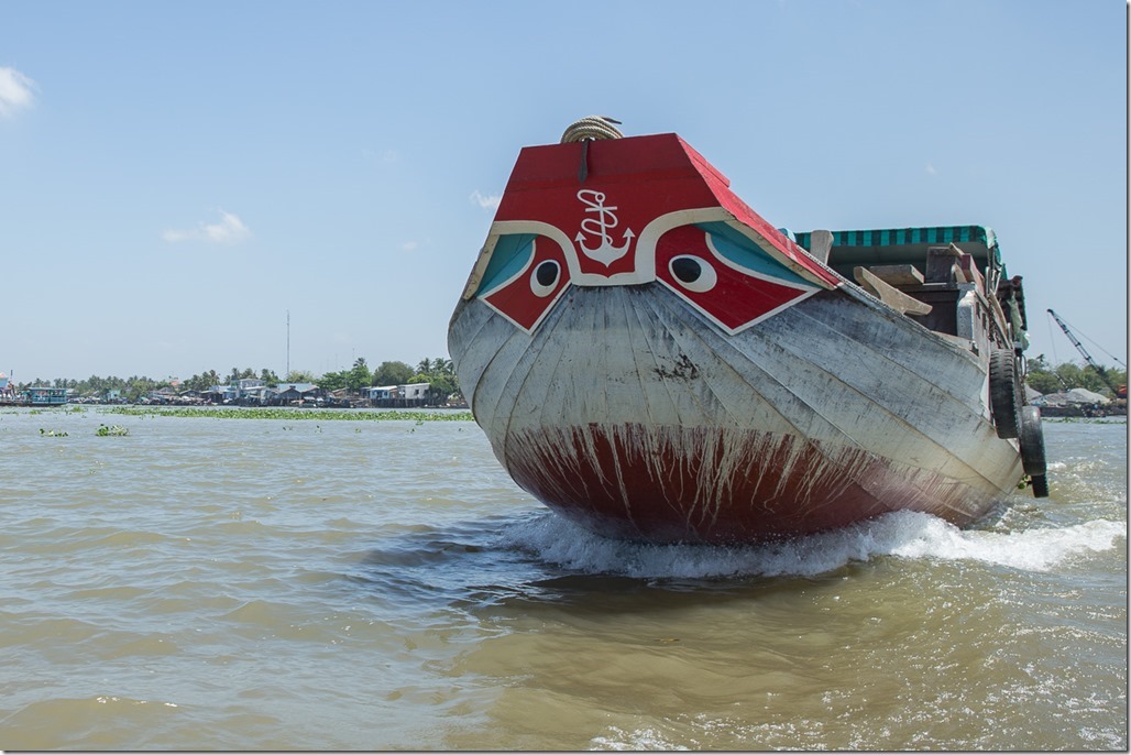 Danach ging es Richtung dem schwimmenden Markt von Cai Be. Wir waren aber entweder zu spät, oder der Markt hier ist nicht wirklich ausgeprägt. Denn es gab nicht viele kleinen Boote. Die Mehrzahl der Boote waren grössere Hausboote, die hier geankert hatten. Man beachte die Antenne für den Fernsehempfang.