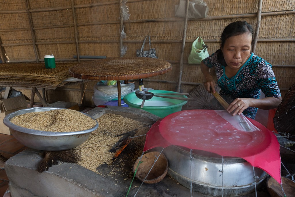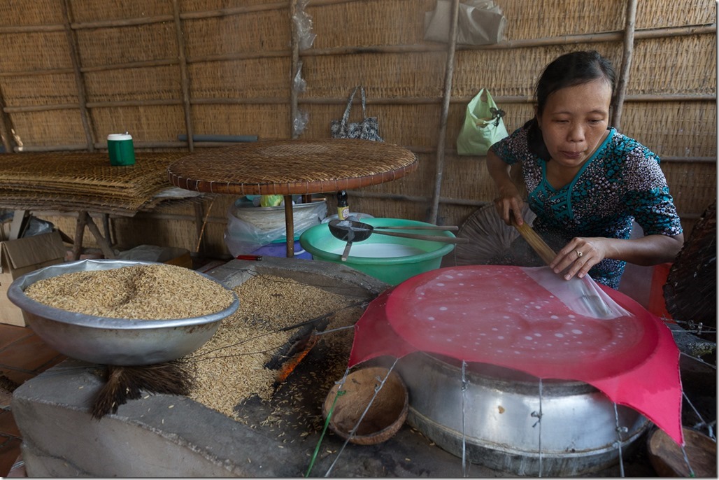 Herstellung von Reispapier. Das Feuer wird mit Reisspreu gemacht, darüber wird ein Tuch gespannt auf dem dann das Reispapier gedämpft wird.
