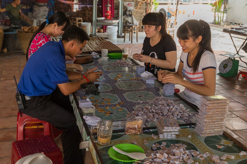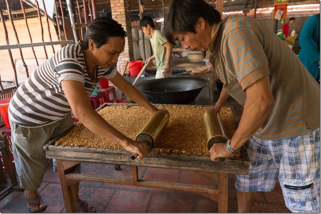 Herstellung von Süssigkeiten aus Erd- und Kokosnuss.