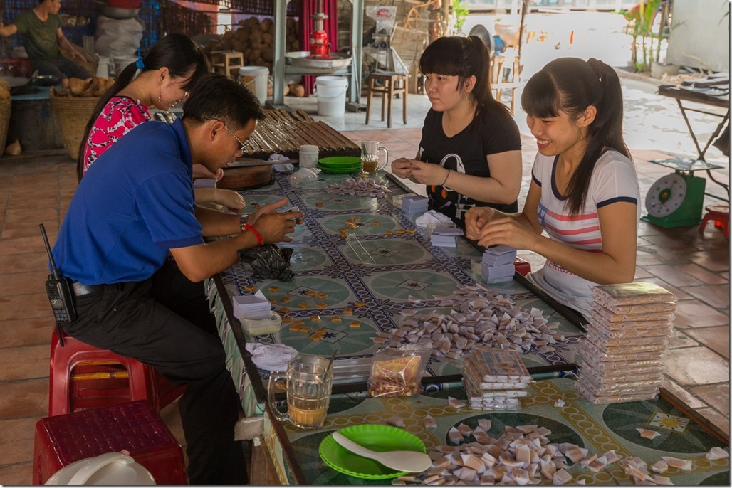 Von Hand wir jedes einzelne Kokosnussguezli verpackt. Wahnsinn! Und dann kosten ein ganzer Pack gerade einmal 1 Fr.