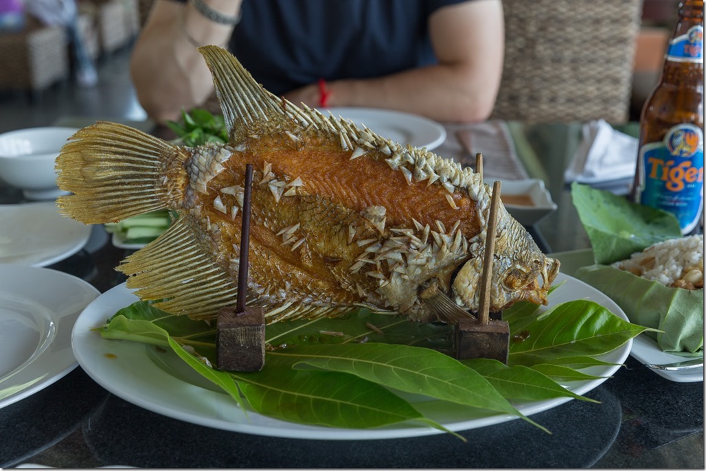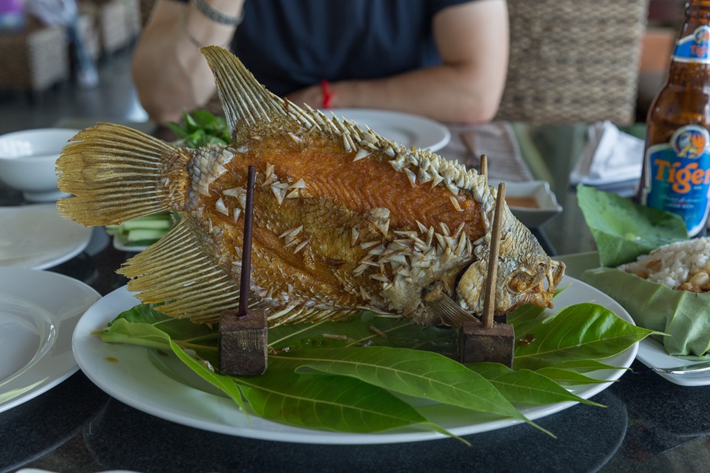 Natürlich wollten wir Vietnam nicht verlassen, ohne den “Elefantenohr Fish” probiert zu haben. Gegessen wird der Fisch, indem das Fleisch zusammen Gemüse und Salat in Reispapier eingewickelt wird.