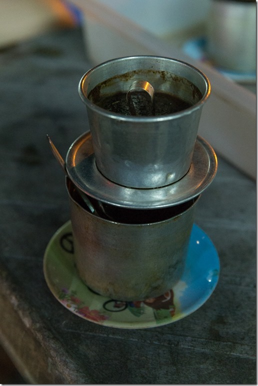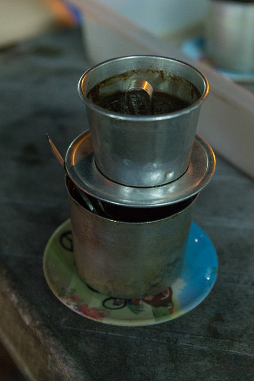 Häufig schon konsumiert, aber noch nie richtig fotografiert, der Vietnamesische Kaffee. Auf einer kleinen Tasse aus Metall oder Glass wir direkt eine Filter aus Metall platziert. Der Kaffee tropft dann langsam nach unten. Gesüsst wird mit Kondensmilch, die man am Schluss einfach aufrührt.