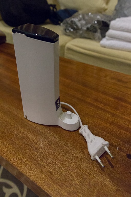 An dieser Stelle möchte ist es nicht versäumen, eine andere moderne Errungenschaft der Menschheit vorzustellen: Die elektrische Zahnbürste beziehungsweise das Ladegerät dazu. Hausi hatte sich entschieden, nicht auf den Komfort der Modernen Zahnhygiene zu verzichten. Bei mir, wo selbst die Unterleibchen auf die Wage mussten und mit 342 Gramm ganz gut abschnitten, wäre so ein Ding schon in der ersten Gewichtsoptimierungsphase rausgefallen. Nicht so bei Hausi. Er setzte voll auf den elektrischen Zahn-Mixer. Nur war da ein kleiner Haken: Die Batterie davon verdiente den Namen nicht mehr und so war sie häufiger am Aufladen als mein Fotoapparat. Wenn wir gerade bei zufälligen Themen sind.