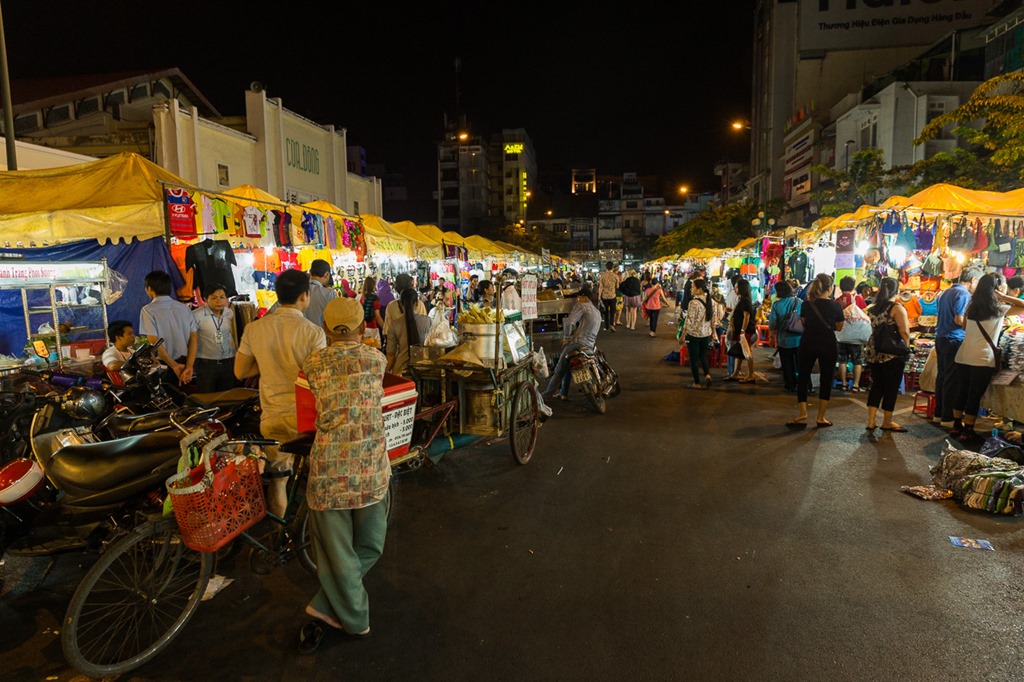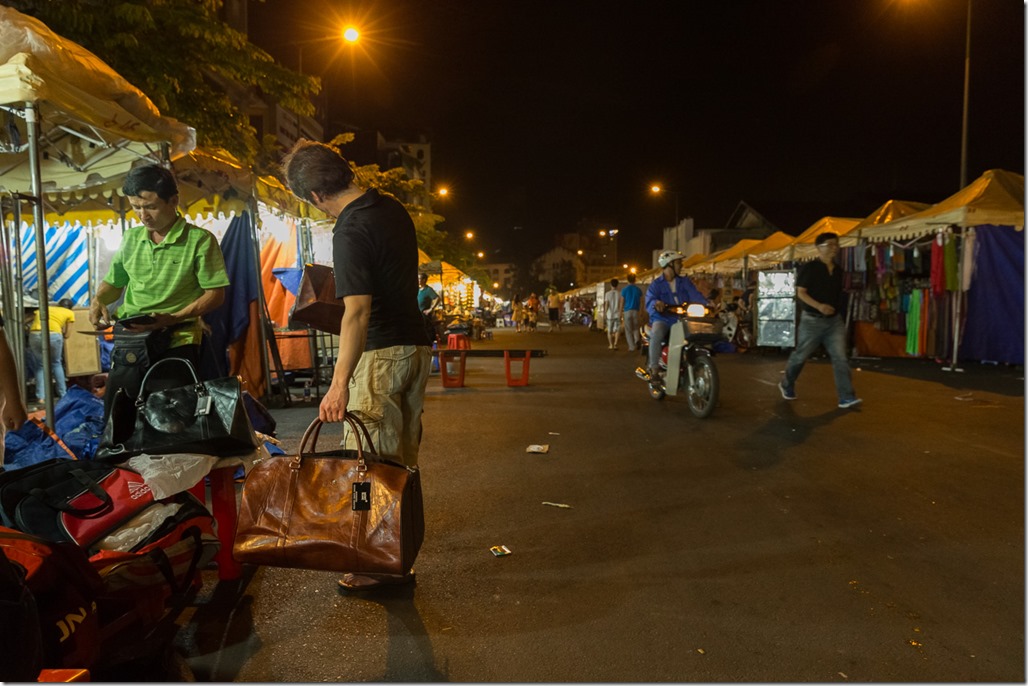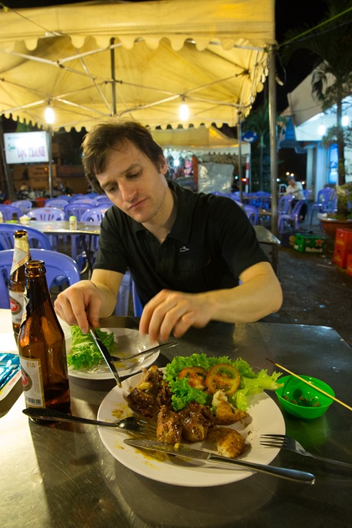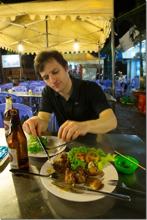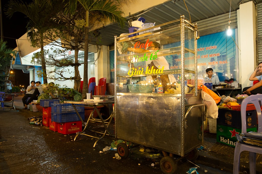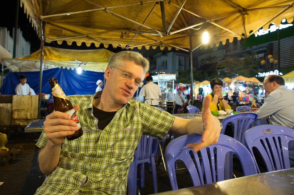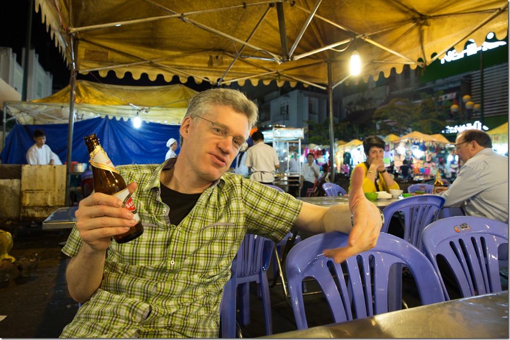 Wie der Abflug musste auf die Ankunft auch angestossen werden, dieses Mal aber mit wirklich lokalem Bier “Saigon Lager”. Typisch auf diesem Bild sind die Plastikstühle und das Faltdach von Strassenrestaurants, alles mobil
