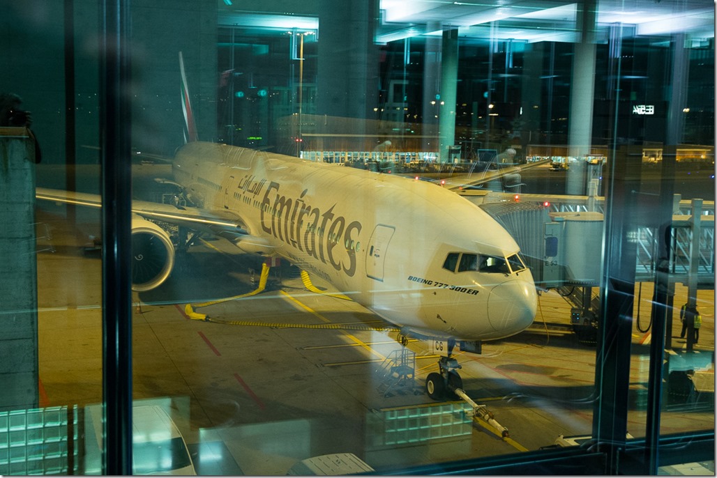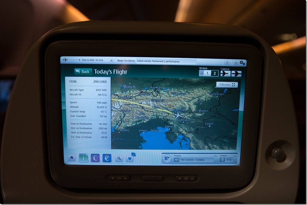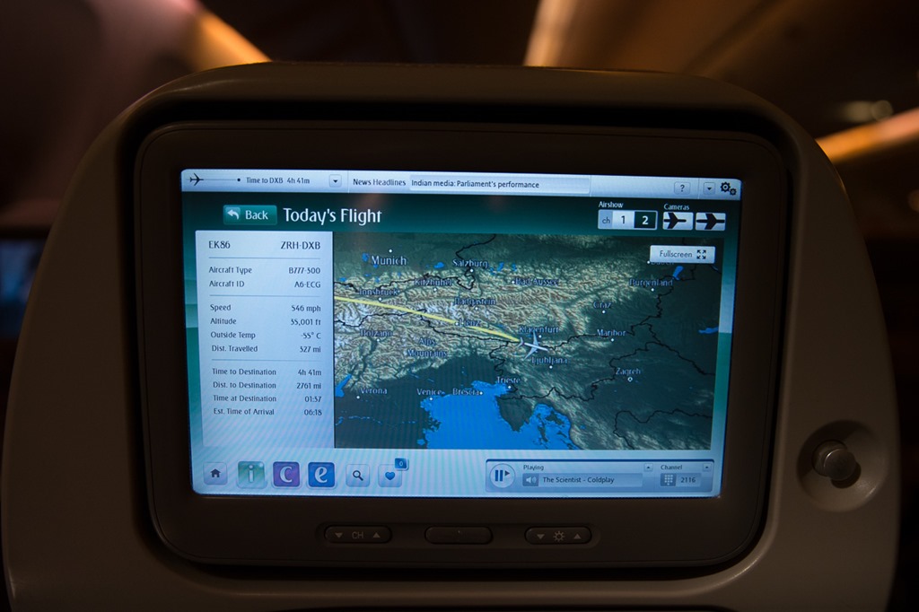 Da die erste Strecke bis nach Dubai ja ein Nachtflug war, gibt es keine Bilder von draussen. Erwähnenswert sei vielleicht, dass dieser Flieger endlich einmal ein Bordunterhaltungssystem hat, dass nicht ständig abstürzt, mit dem Touch-Screen auch auf der Höhe der Zeit ist und man es auch ohne 10 Jährige IT-Ausbildung vernünftig bedienen kann.