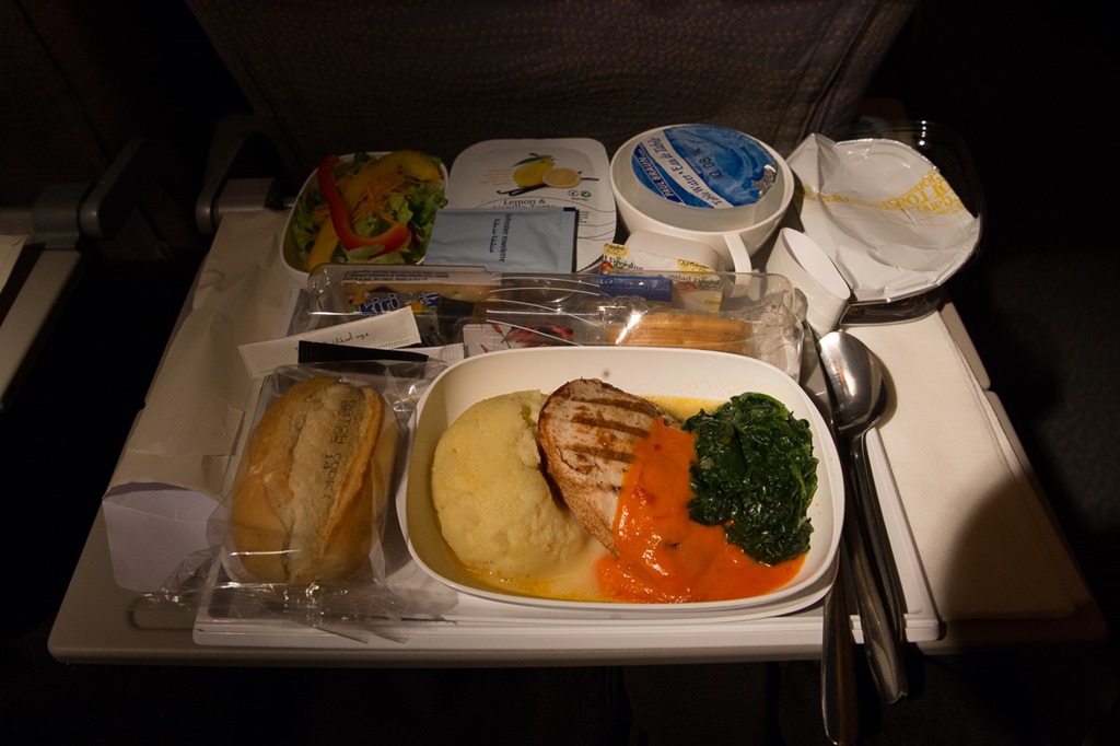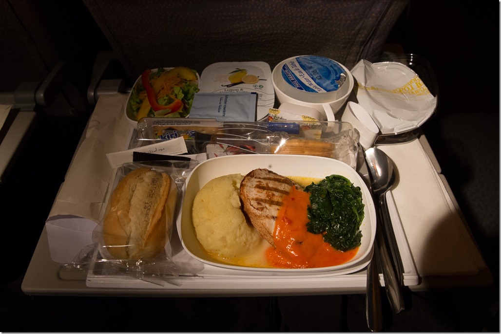 Eco-Food von Emirates, irgendetwas mit Chicken. Die üblichen Platzprobleme sind offensichtlich. Da muss man sich zuerst auf der einen Seite durchessen, dann einiges umlagern bis man z.B. beim Dessert mit dem Kaffee angelangt ist.
