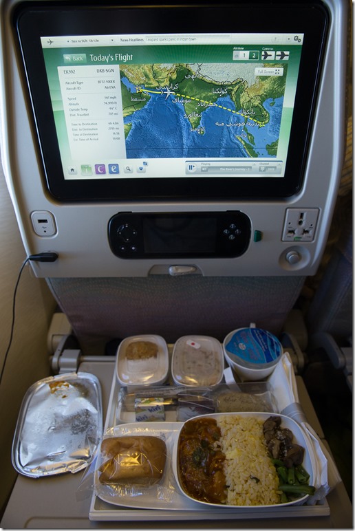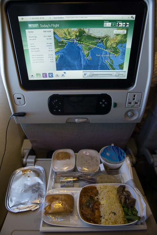Der Weiterflug von Dubai nach Ho Chi Minh City verlief ohne Problem und dauert um die 6 Stunden. Dieses Mal war statt Chicken bei mir Fisch an der Reihe. Die Platzprobleme beim Essen aber immer noch die gleichen. Apropos Platz: Emirates scheint 1-2 Zentimeter mehr Beinfreiheit zu haben als andere Fluggesellschaften. Das tönt nach nicht viel, macht sich bei mir aber bei einem langen Flug positiv bemerkbar.