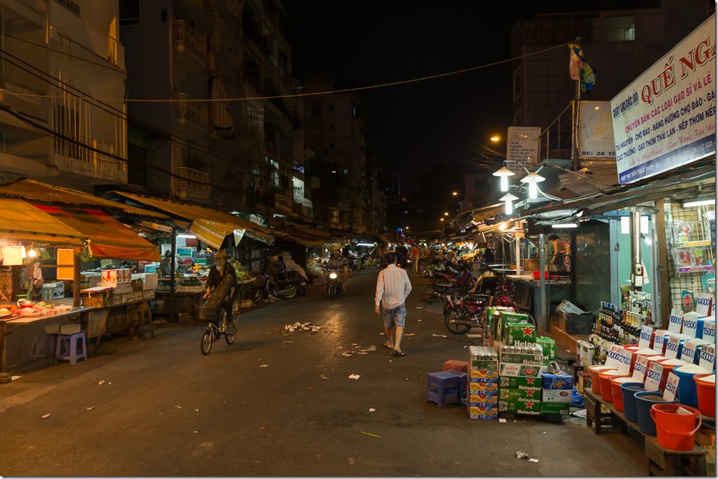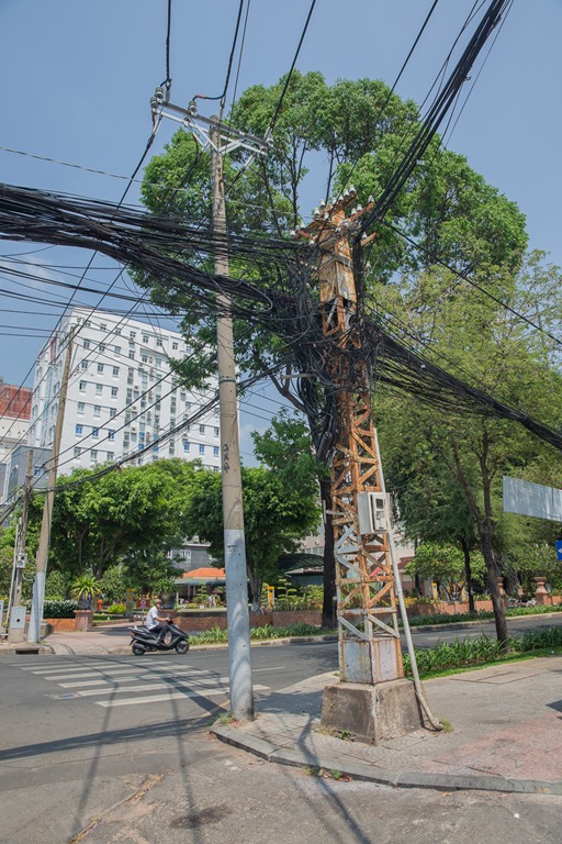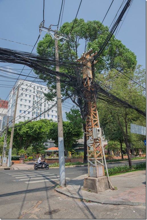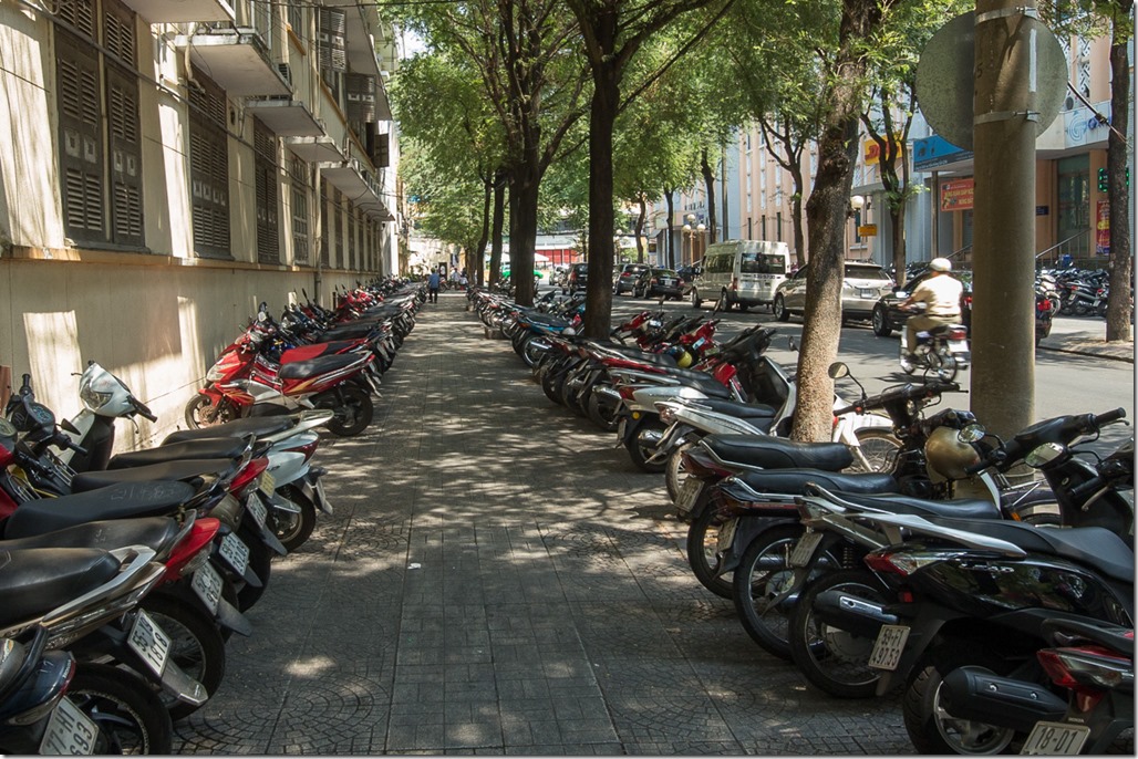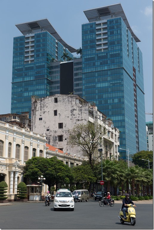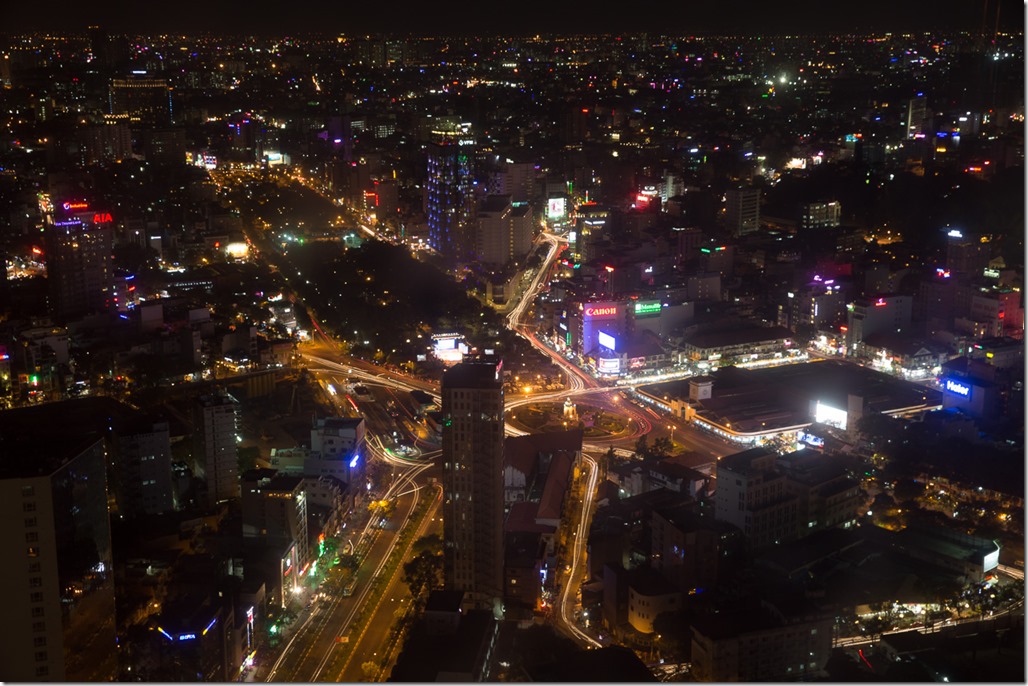 Das folgende Bild zeigt das “dynamische” Kreuzen. Wo immer sich eine Lücke auftut, wird sie verwendet. Das Tüten ist dabei allgegenwärtig und wird nicht als “Mahnung” wie bei uns sondern als “Achtung ich komme” eingesetzt. Straße Überqueren geht etwa gleich. Man geht langsam los, sucht den Blickkontakt zu den herannahenden Fahrzeugen und … irgendwie geht es gut. Auf diesem Bild sieht man auch das mit 268m höchste Gebäude von Saigon. Die Bilder von der Nacht worden von dort, auf der Höhe der hervorstehenden Plattform geschossen.