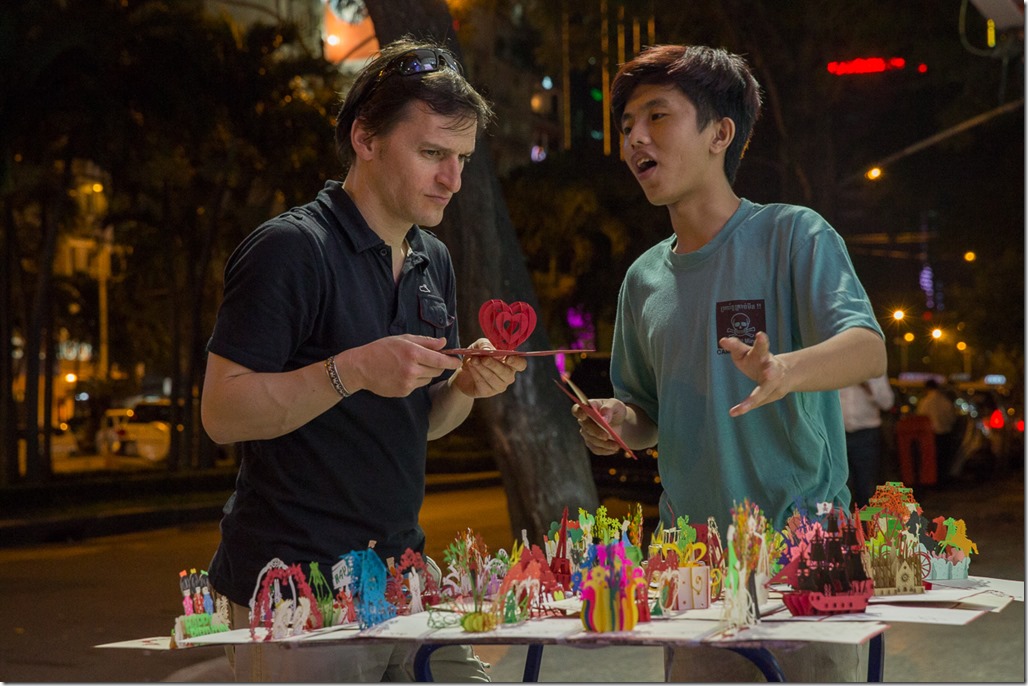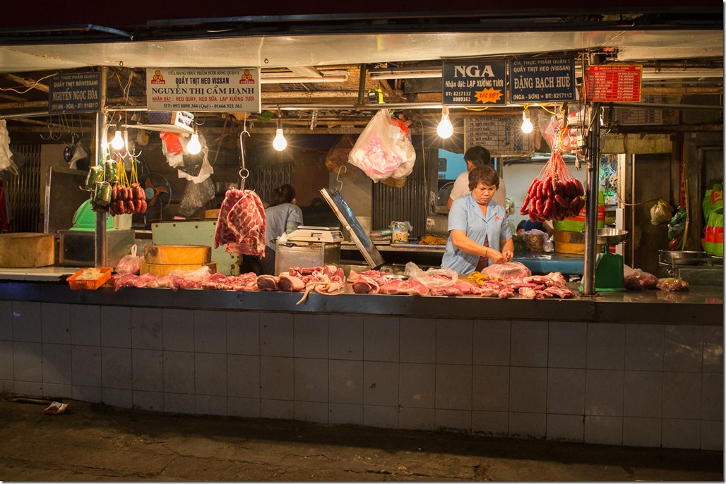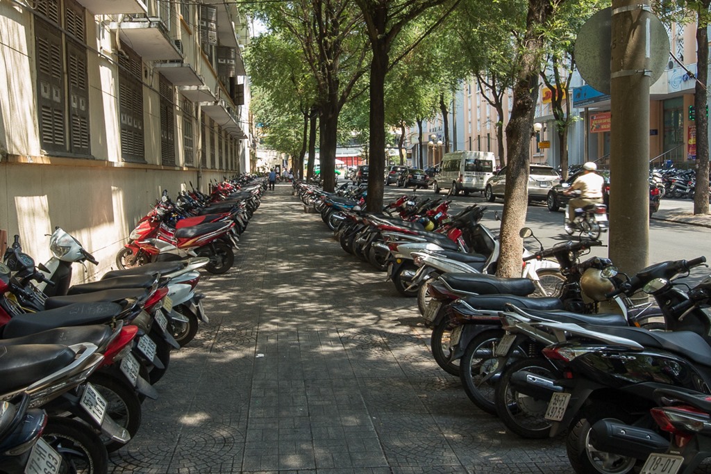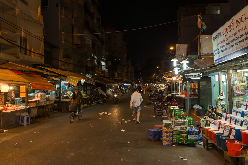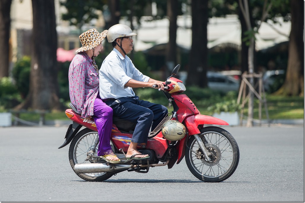 Das folgende Bild zeigt das “dynamische” Kreuzen. Wo immer sich eine Lücke auftut, wird sie verwendet. Das Tüten ist dabei allgegenwärtig und wird nicht als “Mahnung” wie bei uns sondern als “Achtung ich komme” eingesetzt. Straße Überqueren geht etwa gleich. Man geht langsam los, sucht den Blickkontakt zu den herannahenden Fahrzeugen und … irgendwie geht es gut. Auf diesem Bild sieht man auch das mit 268m höchste Gebäude von Saigon. Die Bilder von der Nacht worden von dort, auf der Höhe der hervorstehenden Plattform geschossen.