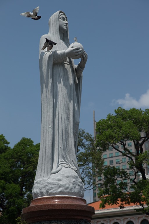 Die Statue vor der Kirche mit tieffliegenden Tauben.
