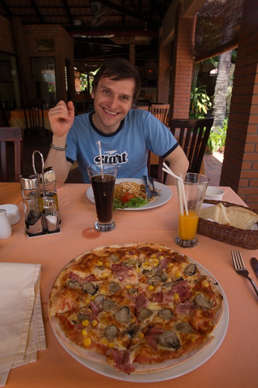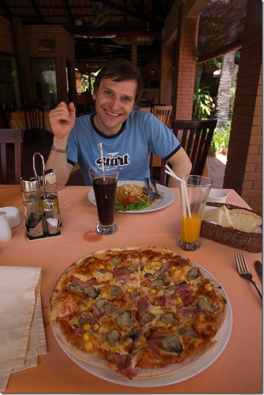 In Phan Thiet angekommen mussten wir uns zuerst das Fortbewegungsmittel für die Weiterreise suchen. Es waren von hier noch rund 30 Kilometer bis nach Mui Ne. Eigentlich wollten wir einen Bus nehmen, diese waren aber aus einem unbekannten Grund nicht verfügbar. Deshalb entschlossen wir uns für einen Taxi. Das war aber leichter gesagt als getan, nicht wegen des mangelnden Angebots an Taxis, sondern weil es lange dauert, bis man die überrissenen Preise einigermassen in einen vernünftigen Bereich gehandelt hat, wohlgemerkt, dass die Taxifahrer praktisch kein Englisch können. In Mui Ne angekommen, mussten wir uns sogleich von den Strapazen erholen. Food musste her. Da wir nicht lange suchen wollen ging es in die erste Wirtschaft, die an der Strasse lag. Ein kleiner Kulturschock: Italienisch. Natürlich bestellte ich meine weltweite Referenz-Pizza “Quattro Stagioni” und die hinterliess erstaunlicherweise gar keinen schlechten Eindruck. In der Zwischenzeit hatten wir zwei weitere Tatsachen festgestellt. Mui Ne ist fest in Russischer Hand. Fast alles ist auch auf Russisch angeschrieben. Und zweitens ist Mui Ne ein seeeehr langgezogenes Dort und wir waren noch kilometerweit entfernt von der vermuteten Position von unserem Nächsten Nachtlager.